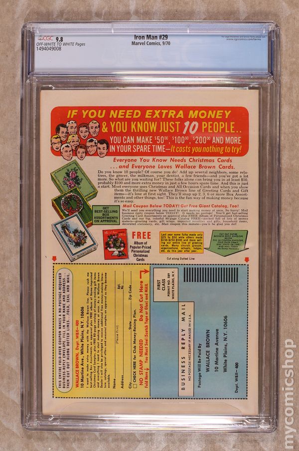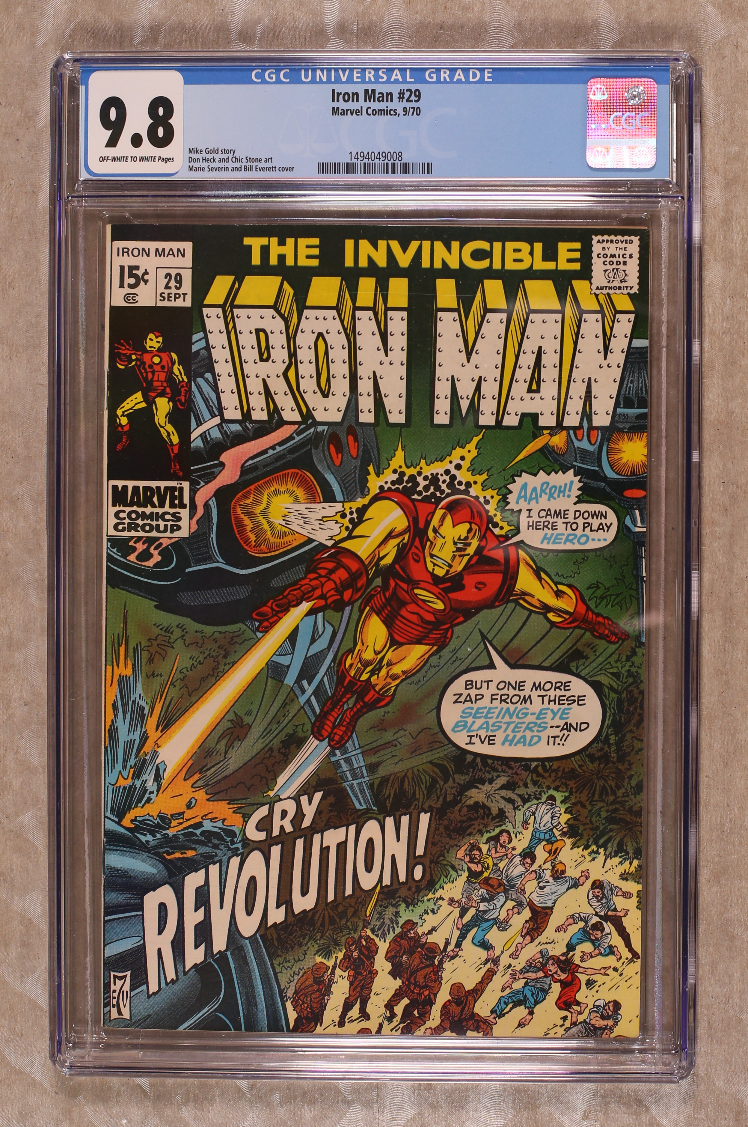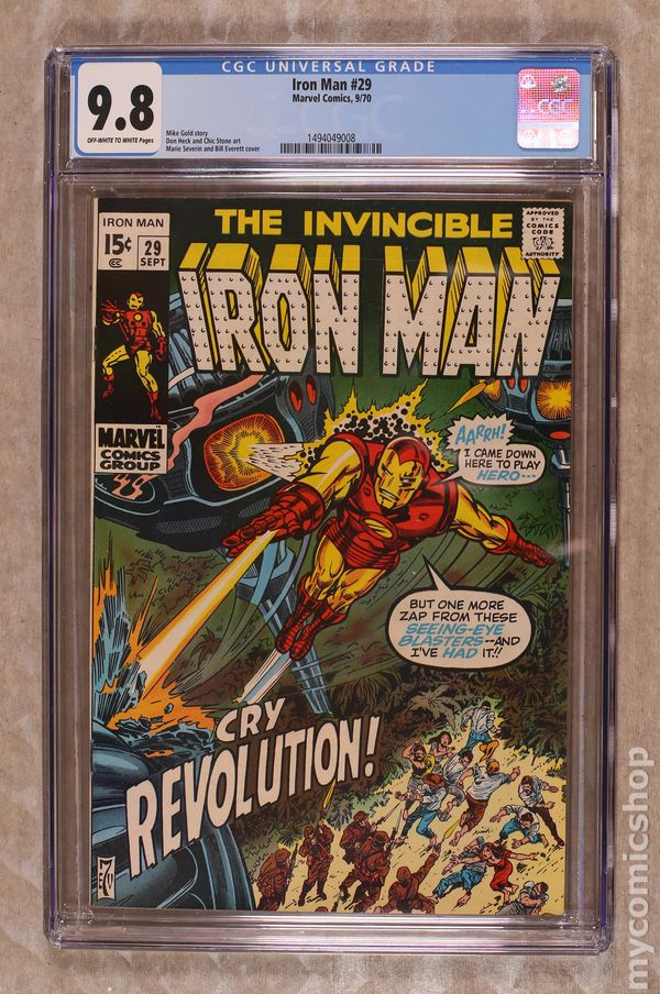 "Save the People ? Save the Country!" Story by Mimi Gold. Art by Don Heck and Chic Stone. Cover by Marie Severin and Bill Everett. Tony Stark is on vacation in the Caribbean when he suddenly encounters political refugees from a nearby island. A tyrant called the Overseer has taken over the small island nation. Now Tony has a decision to make: is the golden avenger going to become a freedom fighter? 32 pages Cover price $0.15. Grade: CGC 9.8 explanation of grade Condition: Used (collectible)
