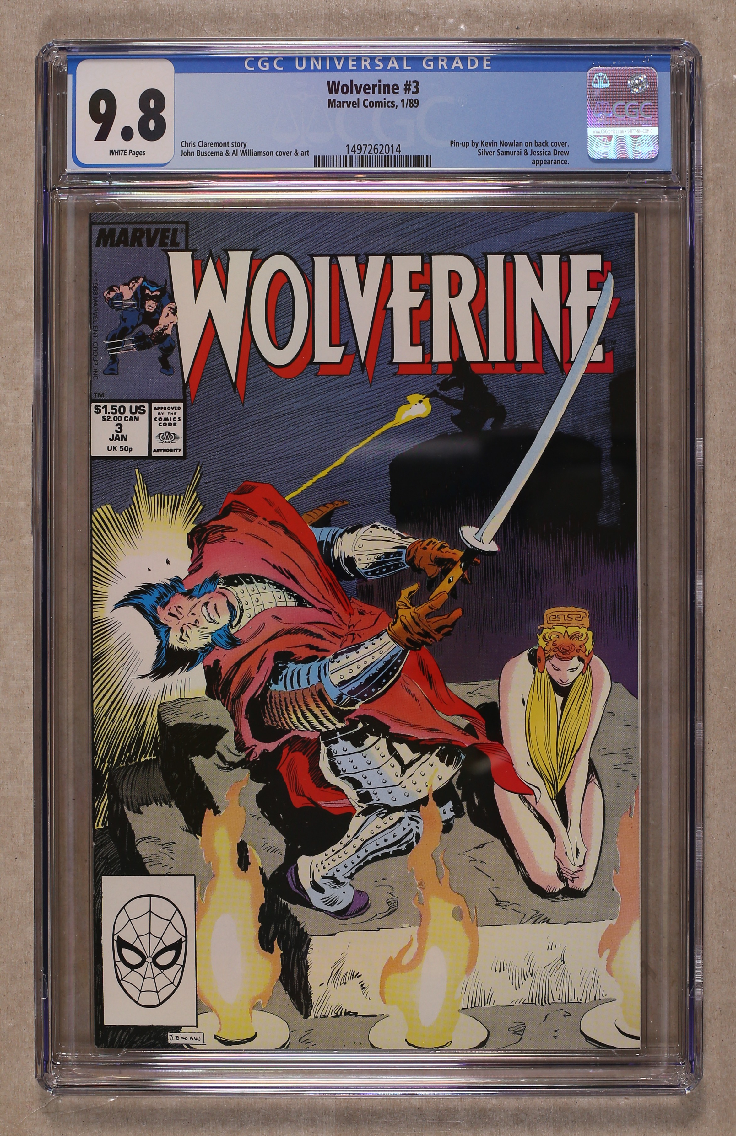 Direct Edition. Part 3 of 3 - "The Black Blade!" Written by Chris Claremont. Art by John Buscema and Al Williamson. Oh no, Wolverine is possessed by the Black Blade and is about to sacrifice Jessica Drew, unless McCabe and Silver Samurai can stop him. Kevin Nowlan art on back cover. 32 pages, FC Cover price $1.50. Grade: CGC 9.8 explanation of grade Condition: Used (collectible)
