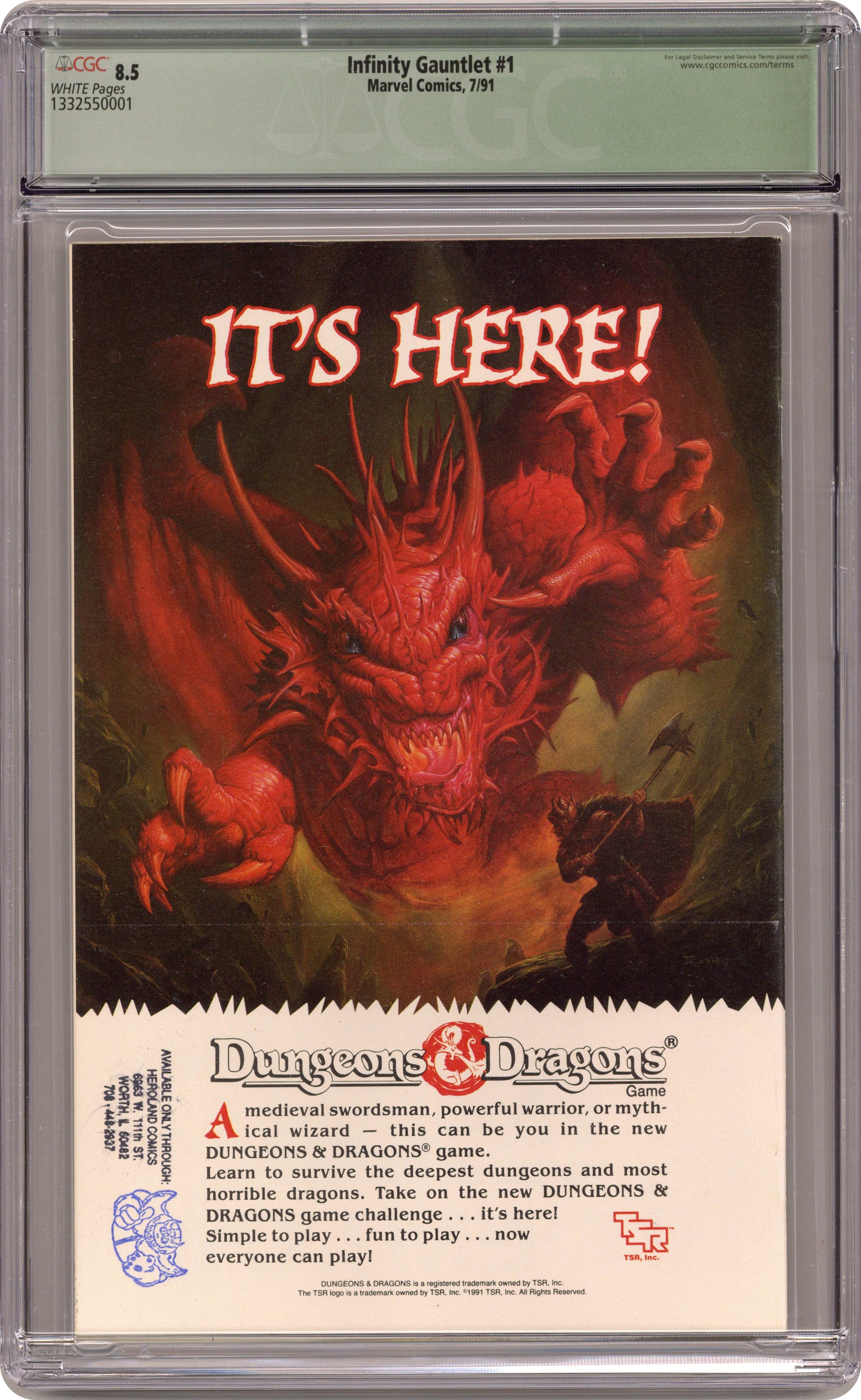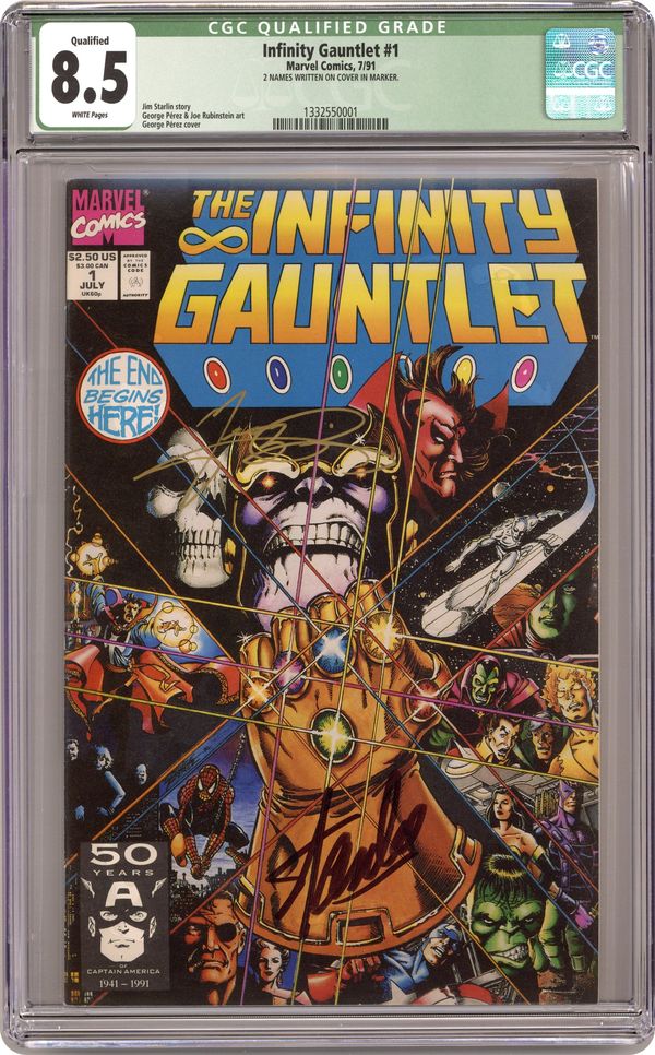 Direct Edition. Part 1 of 6. "God!" Story by Jim Starlin. Art by George Perez, Joe Rubinstein and Tom Christopher. Story continued from Thanos Quest #1-2 and Silver Surfer (1987-98 2nd Series) #50. The Silver Surfer crashes to earth and into the Sanctum Sanctorum of one Doctor Strange. The Sentinel of the Spaceways, barely alive after a grueling ordeal, arrives with the warning that the mad Titan, Thanos, has achieved ultimate power. Combining the Infinity Gems into the ominous Infinity Gauntlet, Thanos has become master of the mind, space, time, power, reality and the soul. And with his first act of nigh-omnipotent power Thanos eradicates half the population in the universe. Can the surviving heroes of Earth mount an offensive against this supreme power for evil and destruction, plus who are the mysterious new players who've just arrived on the scene? Cover price $2.50. Grade: CGC 8.5 explanation of grade Condition: Used (collectible)