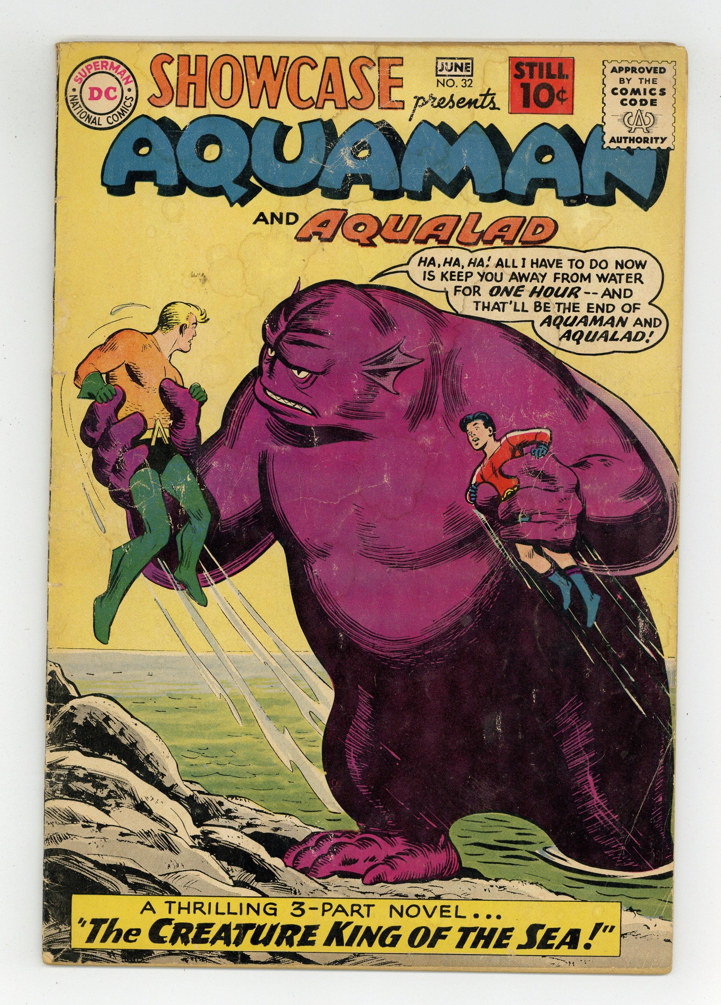 Cover art by Nick Cardy. The Creature King of the Sea starring Aquaman, Aqualad, and Wilo the Wizard, script by Jack Miller, art by Nick Cardy; Aquaman and Aqualad help a diver recover a lost treasure chest hidden by Wilo the Wizard. 36 Pages, Full Color. Cover price $0.10. Grade: GD- 1.8 explanation of grade Condition: Used (collectible)