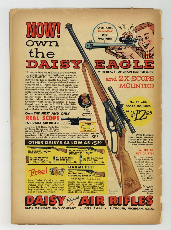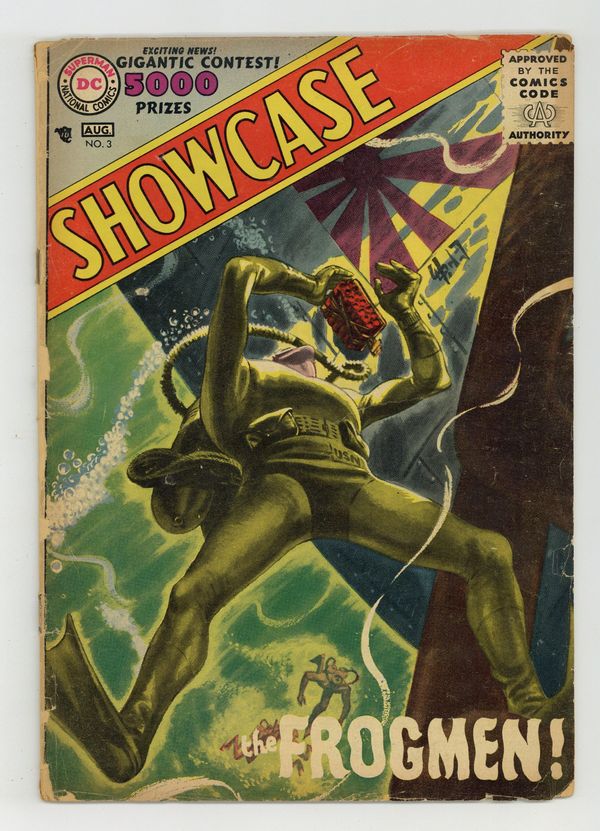 Cover art by Jerry Grandenetti. "The Frogmen!" Part I: The Making of a Frogman!, script by Robert Kanigher, art by Russ Heath; A puny guy has volunteered to train as a frogman (USN UDT, precursors to USN SEALs), but is immediately nicknamed "Sardine" by guys called "Shark" and "Whale." The First Frogmen!; Historical article on Assyrian "frogmen" and Revolutionary War "submarines" trying to sink ships, then WWII frogmen. Part II of "The Frogmen!" Flying Frogmen!, script by Robert Kanigher, art by Russ Heath; The team kills the shark, and "Sardine" and the guys graduate as frogmen; Flying to the Pacific, their DC-4 is shot down, then rammed by a Jap cruiser. Freddie the Frogman humor page by Henry Boltinoff. The Fighting Frogmen article; Article about the origins of modern frogmen and their jobs in wartime. Part III of "The Frogmen!" Silent War!, script by Robert Kanigher, art by Russ Heath. 36 Pages, Full Color. Cover price $0.10. Grade: PR 0.5 explanation of grade Condition: Used (collectible)