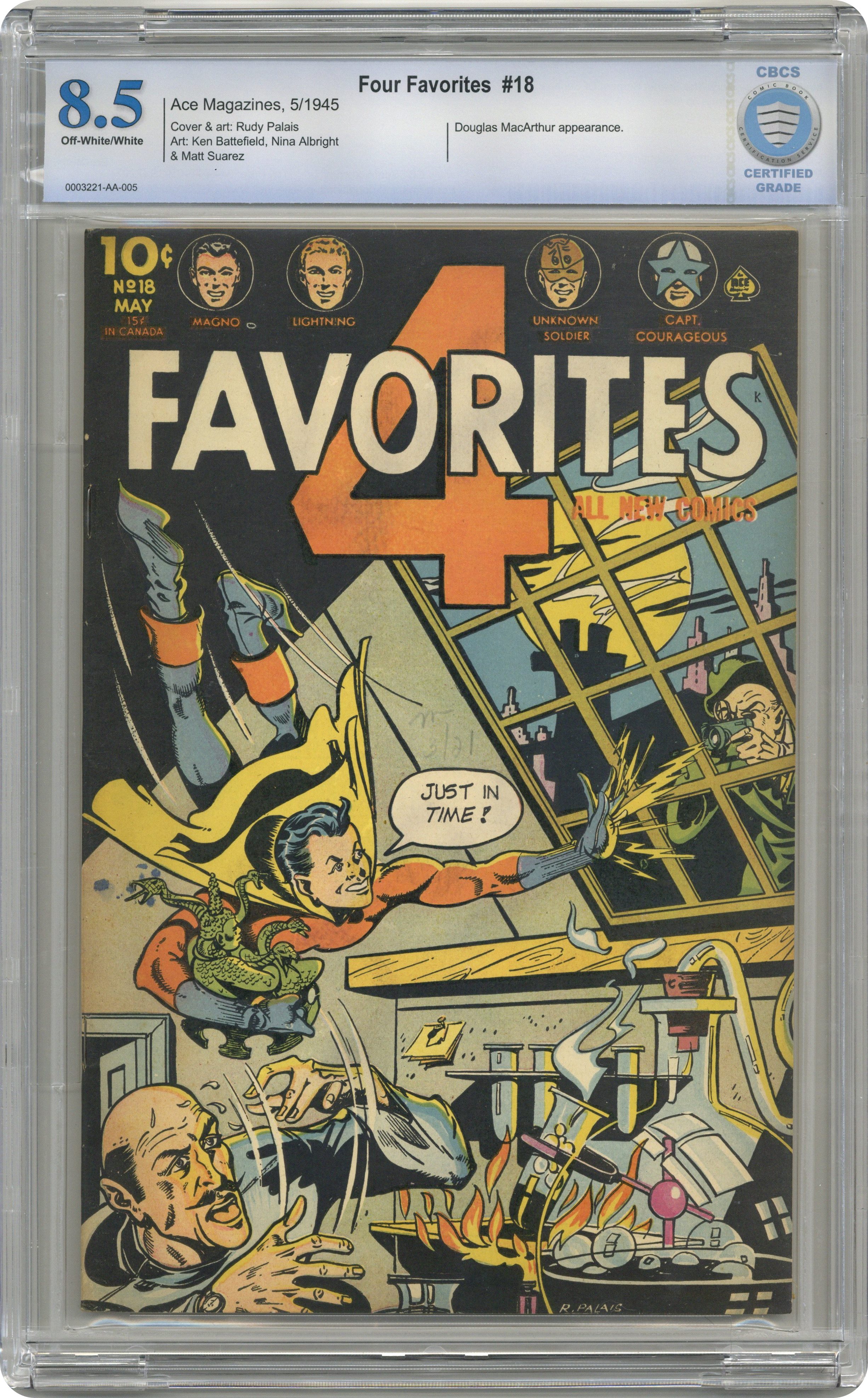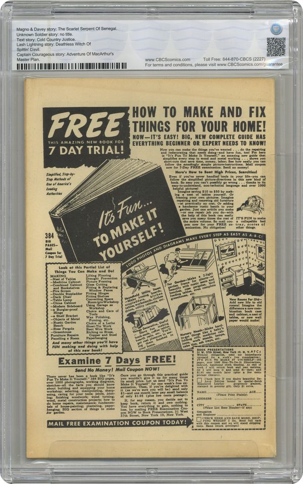 Rudy Palais cover. In order of appearance: "Magno and Davey, The Scarlet Serpent of Senegal!" art by Rudy Palais; "The Unknown Soldier, The Rats in Human Form!"; "Lash Lightning, The Deathless Witch of Spittin' Devil!"; and "Captain Courageous, The Fantastic Adventure of MacArthur's Master Plan!" art by Matthew Suarez. "Cold Country Justice" text story by Ralph Powers, reprinted from Super Mystery Comics Vol. 3 (1942) #3 and from Super Mystery Comics Vol. 4 (1944) #5. 52 pages. Full color. Cover price $0.10. Grade: CBCS 8.5 explanation of grade Condition: Used (collectible)