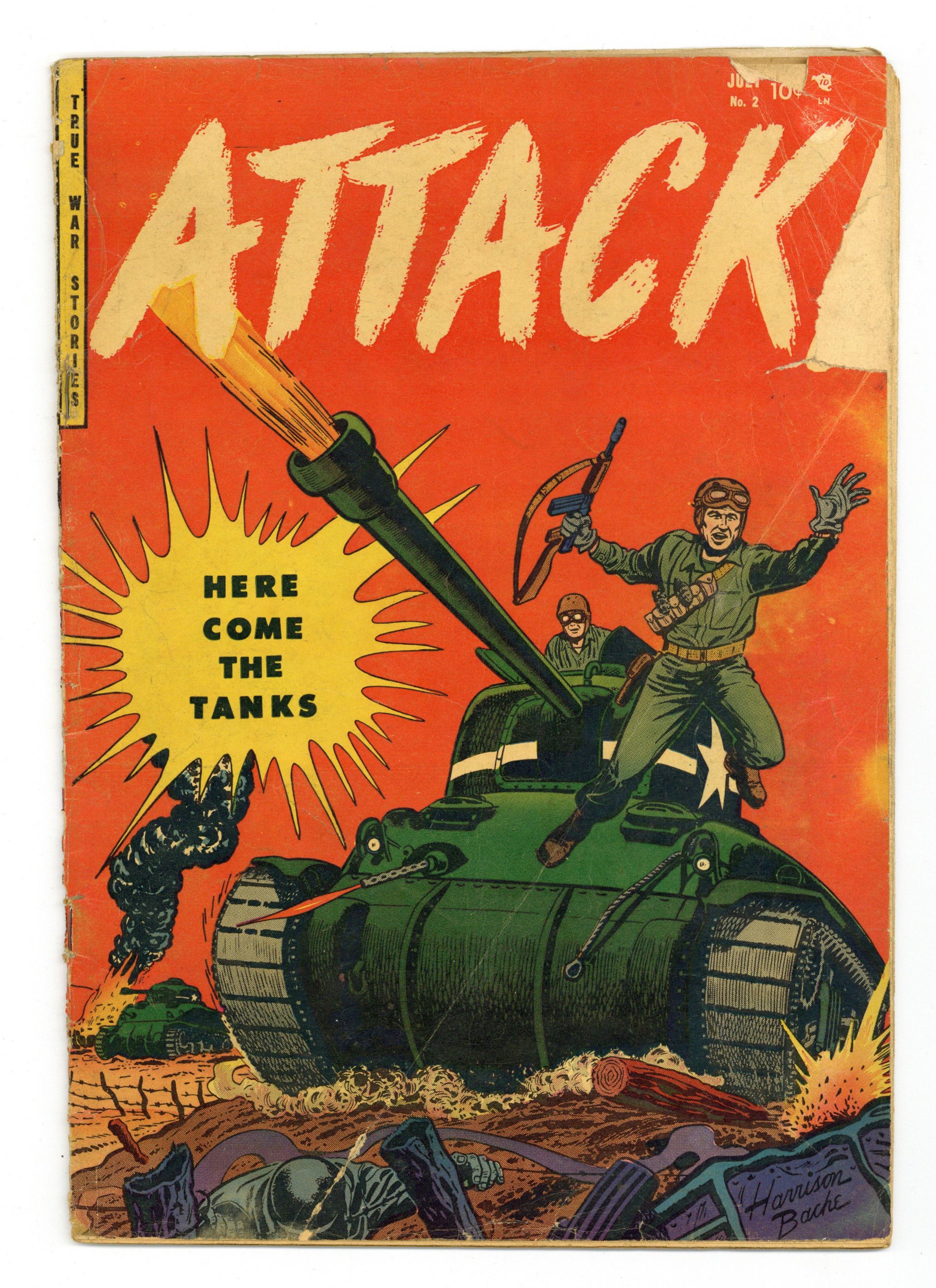 Cover by Harry Harrison and Ernie Bache. Stories and art by Gerald Altman, Harry Harrison and Ernie Bache. Violent pre-Code war comics from Youthful Magazines. The "true" story of Lt. Ramsey Ninninger and his heroic sacrifice on Bataan during WWII. A tank crew makes an amazing discovery on Heartbreak Ridge during the Korean War. A US submarine is ordered to escort millions of dollars out of Manila banks before the advancing Axis line during WWII. Death of a Soldier; Here Come the Tanks; Escape!; Operation Bullion; Bravery Wears No Rank! 32 pages, Full Color. Cover price $0.10. Grade: GD 2.0 explanation of grade Condition: Used (collectible)