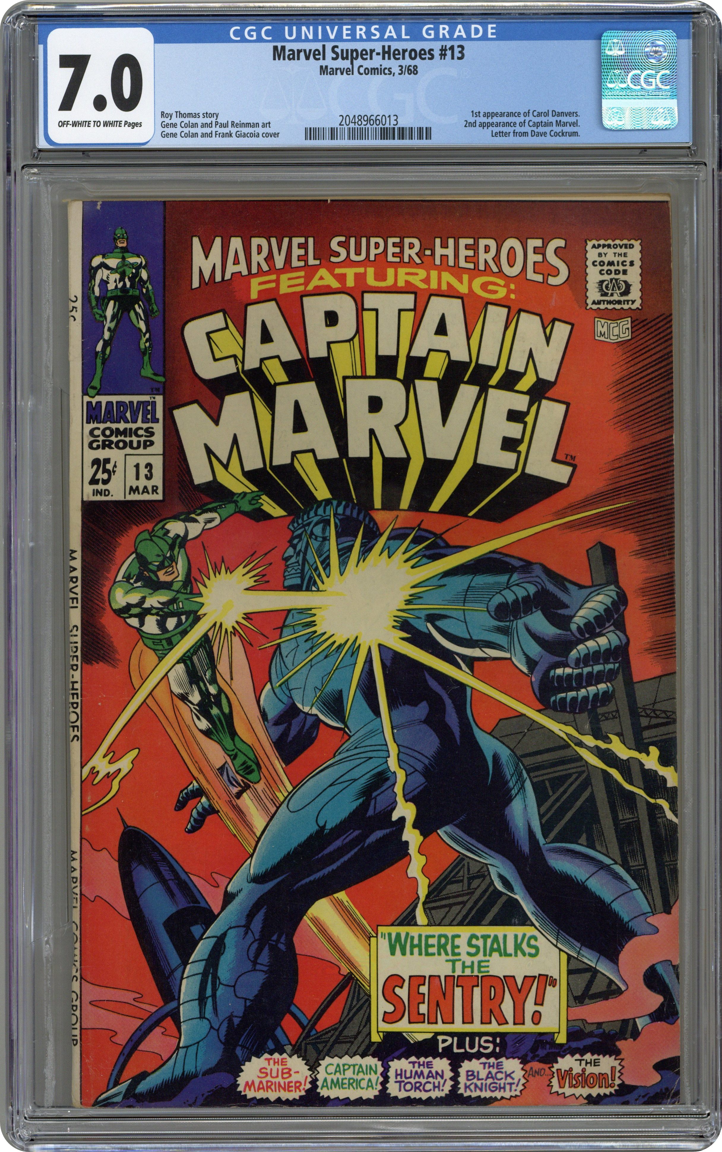 Ended Apr 29 2024 Winning Bid $131 Giant-size issue. Captain Marvel stars in "Where Stalks the Sentry!" Script by Roy Thomas, pencils by Gene Colan, inks by Paul Reinman. The story continues in Captain Marvel 1 (1968). The remainder of the issue consists of Golden Age reprints: the Black Knight by Joe Maneely (1955), the Human Torch by Dick Ayers ("Fugitive at Large!"; 1954); the Vision (1941); Captain America by John Romita Sr. ("Top Secret!"; 1953); and the Sub-Mariner by Bill Everett ("Invasion!"; 1955). Letter to the editor from comic artist Dave Cockrum. Colan cover pencils. 1st Carol Danvers (pre Ms. Marvel). Cover price $0.25. Grade: CGC 7.0 explanation of grade Condition: Used (collectible)