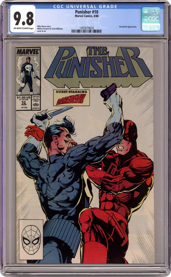 Ended Feb 6 2024 Winning Bid $69 Direct Edition. Crossover with Daredevil (1964-1998 1st Series) #257. Story by Mike Baron. Art by Whilce Portacio. Daredevil and the Punisher are like fire and ice. They just don't play well together. A known criminal is on the loose and Daredevil wants him to stand trial for his crimes but Frank intends to see that he never makes it to court. Sit back and enjoy a Daredevil/Punisher brawl the likes of which you've never seen before. It's a story told from two points of view. This is the Punisher's point of view. Read Daredevil #257 for 'ole Hornhead's. 32 pages. Cover price $1.00. Grade: CGC 9.8 explanation of grade Condition: Used (collectible)