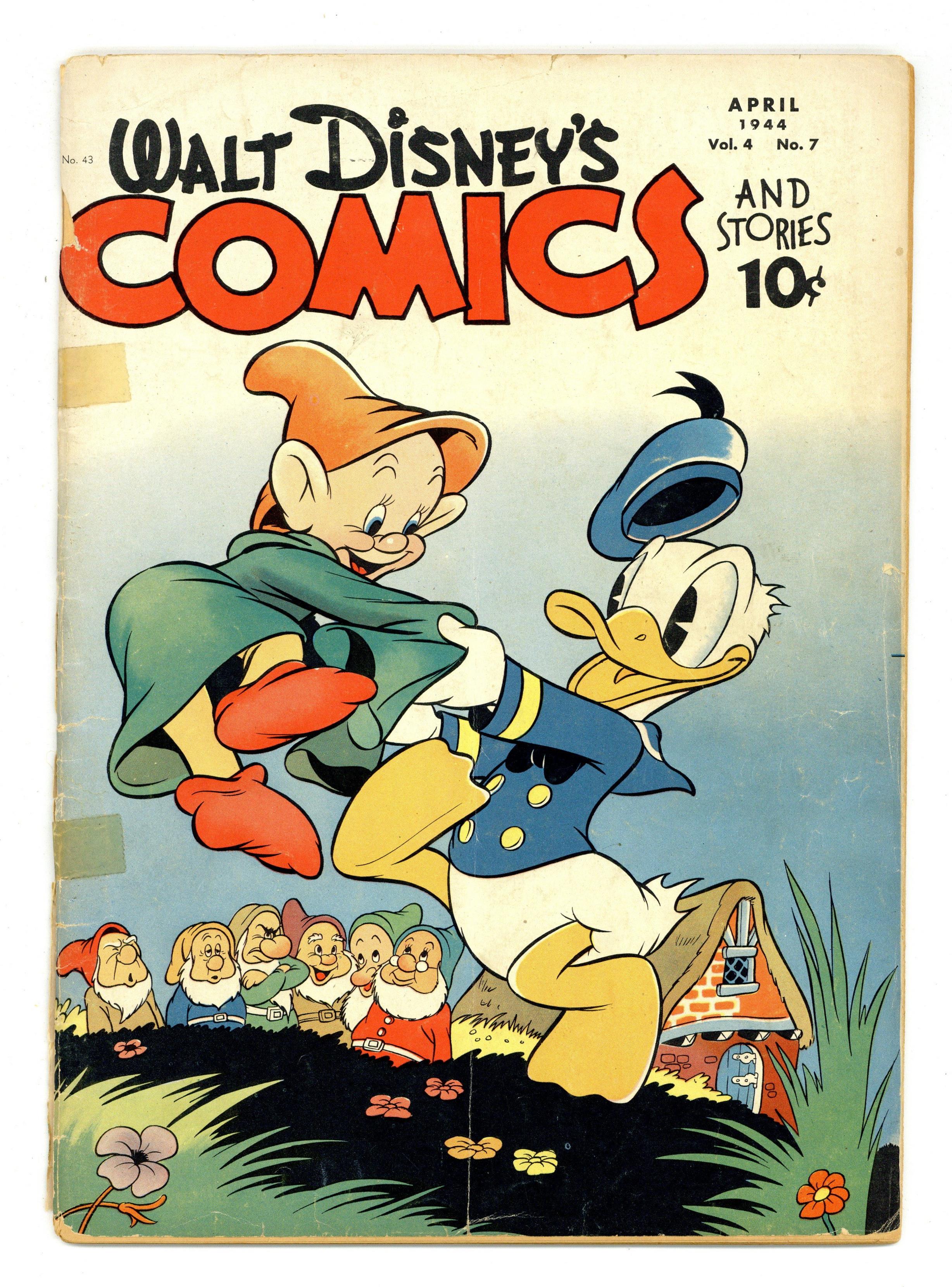 Cover by Walt Kelly. Stories and art by Walt Kelly, Carl Barks, Floyd Gottfredson, Merrill De Maris, Bob Karp, Hubie Karp, Carl Buettner, George Waiss, Veve Risto, Roger Armstrong, Manuel Gonzales, Sylvia Holland, Bill Wright, and Al Taliaferro. Sometimes listed as Vol. 4 #7. The long-running vehicle for Disney character comics featured work by Carl Barks, Floyd Gottfredson, and Pogo's Walt Kelly. In a classic Floyd Gottfredson story from the Mickey Mouse comic strip, Professor Dustibones enlists Mickey for a journey to a land of prehistoric creatures. In a story by Barks, Huey, Dewey and Louie vow never to take a bath again, leading to a war with Donald to get them in the tub. In a story by Kelly, Donald Duck meets the Seven Dwarfs. Three Dirty Little Ducks; Bucky Bug; Mickey Mouse; The Treasure Hunt; Heel Make Money!; Its a Wonderful Institution!; Whats in a Name?; Timber!!; A Damp Argument; Donald Duck and the Seven Dwarfs; Mickey Mouse: In the Land of Long Ago; Accommodating!; A Thirst Quencher; In a Jam. 48 pages, Full Color. Cover price $0.10. Grade: PR 0.5 explanation of grade Condition: Used (collectible)