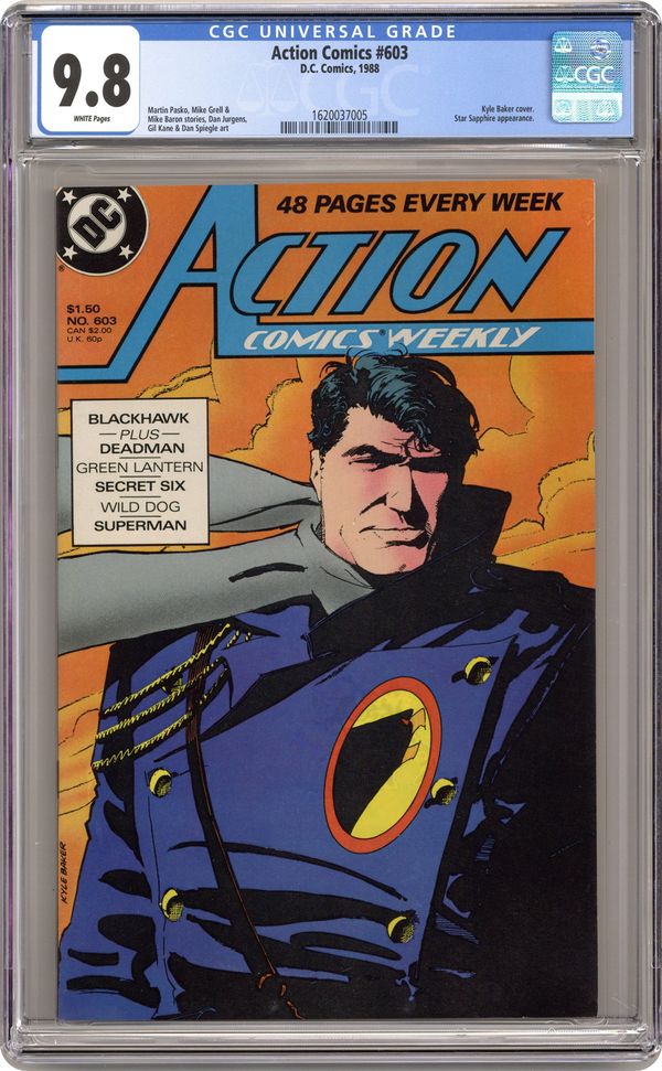 Cover by Kyle Baker. "Retribution!", script by James Owsley (Christopher Priest), art by Gil Kane; Authorities believe that John Stewart crashed the F-14 into Coast City; Hal Jordan and Star Sapphire battle. "Spread Your Broken Wings And Learn To Fly," script by Martin Pasko, art by Dan Spiegle; The new Secret Six receives their orders and begins action, while the death of the old Secret Six is discovered. "Chapter 3 Talaoc's Tale," script by Mike Baron, pencils by Dan Jurgens, inks by Tony DeZuniga; Deadman questions Talaoc while the C.I.A. discovers weapons in the pyramid Talaoc was entombed in. "More Powerful Than A Locomotive!", script by Roger Stern, pencils by Curt Swan, inks by John Beatty; Superman chases Bob Galt's would-be assassins: one kills another and 2 are captured. "Moral Stand Chapter 3 Censored," script by Max Collins, pencils by Terry Beatty, inks by John Nyberg; The police begin an investigation into the destruction of Readworld, and Lt. Flint proposes that Jack Wheeler go undercover in the Legion of Morality. "Another Fine War, Chapter 3," script by Mike Grell, pencils by Rick Burchett, inks by Pablo Marcos; Cynthia Hastings helps outfit Blackhawk for the job. 52 pages, Full Color, $1.50. Cover price $1.50. Grade: CGC 9.8 explanation of grade Condition: Used (collectible)