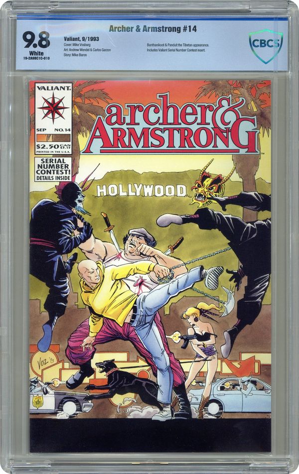 Ended Aug 26 2024 Winning Bid $12 Cover art by Mike Vosburg. "Housewreckers," script by Mike Baron, pencils by Andrew Wendel, inks by Carlos Garzón; Death has arrived at Archer & Armstrong's doorstep!; When a mysterious group of assassins puts Armstrong in their crosshairs, he and Archer must defend their mansion from an all-out assault! But as the duo repel their attackers, an even more dire threat emerges from the unlikeliest of places!; Plus, has Archer met the girl of his dreams? Characters: Archer; Armstrong; Banthanikoot; Bobby Ripp; Mr. Duerst; Pamela Trice; Panduit the Tibetan. 36 pgs., full color. Cover price $2.50. Grade: CBCS 9.8 explanation of grade Condition: Used (collectible)