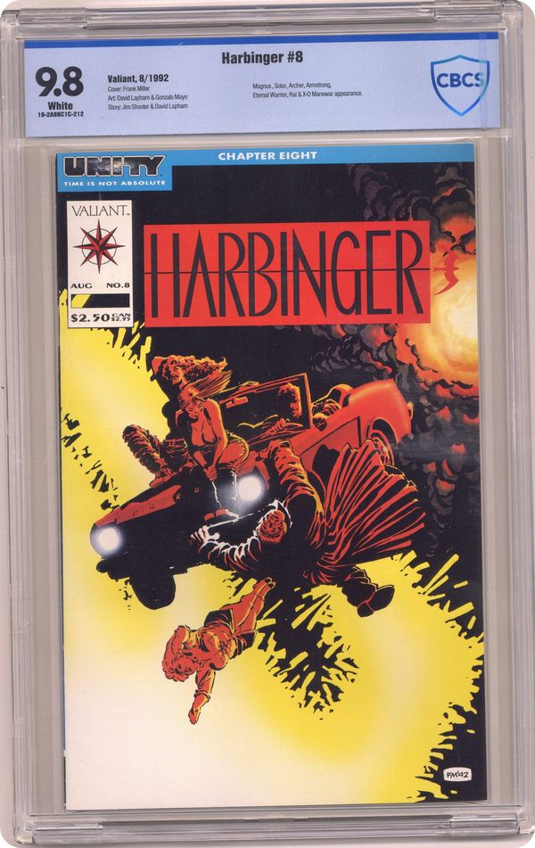 Ended Sep 10 2024 Winning Bid $11 Cover art by Frank Miller. Heart Failures (Unity chapter 8) starring Eternal Warrior, Archer and Armstrong, X-O Manowar, Solar Man of the Atom, Magnus Robot Fighter, Rai, and Shadowman, script by Jim Shooter (plot and script) and David Lapham (plot), pencils by David Lapham, inks by Gonzalo Mayo; In Unity, the kids learn that Kris is going to have a baby. 36 pgs. $2.50. Cover price $2.50. Grade: CBCS 9.8 explanation of grade Condition: Used (collectible)
