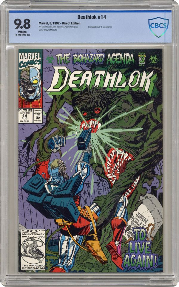 Ended Jun 27 2024 Winning Bid $16 At Deathlok's Door, script by Dwayne McDuffie, pencils by Mike Manley, inks by Mike Manley, John Heebink (Ink Assist), and Adam McClellan (Ink Assist); The Billy Hansen clone meets with Deathlok at his home to tell the cyborg about the previous Deathlok, John Kelly, and how Kelly's brain mutated into Biohazard; The Biohazard DNA takes over the Hansen clone and mutates it into a second version of Biohazard; The new Biohzard attacks the Collins family. 36 pgs. $1.75. Cover price $1.75. Grade: CBCS 9.8 explanation of grade Condition: Used (collectible)