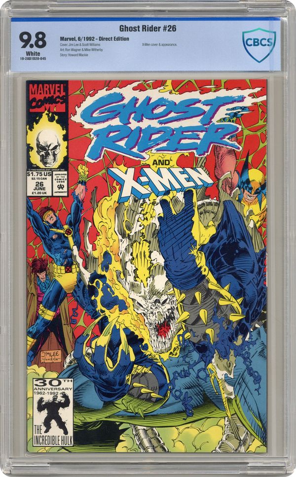 X-/Ghost Rider Crossover – Part 2 of 4 - " Blood Feud!" Guest-starring the X-Men. Written by Howard Mackie. Art by Ron Wagner and Mike Witherby. Story continued from X-Men (1991 1st Series) #8. In New Orleans, a black clad assassin kills Bernard le Branche. Ghost Rider arrives in New Orleans seeking Johnny Blaze's help in healing Dan Ketch, but ruminates on his lack of self-knowledge and the fragility of his tether to humanity. Outside the city, the X-Men, en route to prevent a bloody war between the Thieves' and Assassins' Guild, are pulled over by Deputy Sheriff. Wolverine and Jubilee subdue the deputy, while Cyclops and Gambit destroyed his car. While riding in through the citys alleyways, Ghost Rider witnesses the assassin's murder of another Guild thief and his pregnant wife. The assassin lures Ghost Rider underground where he is surrounded by Guild Assassins, who transform into Brood drones and restrain him. The X-Men reunite with Bella Donna Boudreaux and Rogue, who arrived ahead to perform recon. The X-Men and Bella Donna find the murdered Thief couple, but Wolverine's senses direct them to the assassins underground layer. The Brood then attacks the X-Men, who are horrified to see that one of the Brood has taking Ghost Rider as a host. Story continues in X-Men (1991 1st Series) #9. 32 pages, FC. Cover price $1.75. Grade: CBCS 9.8 explanation of grade Condition: Used (collectible)