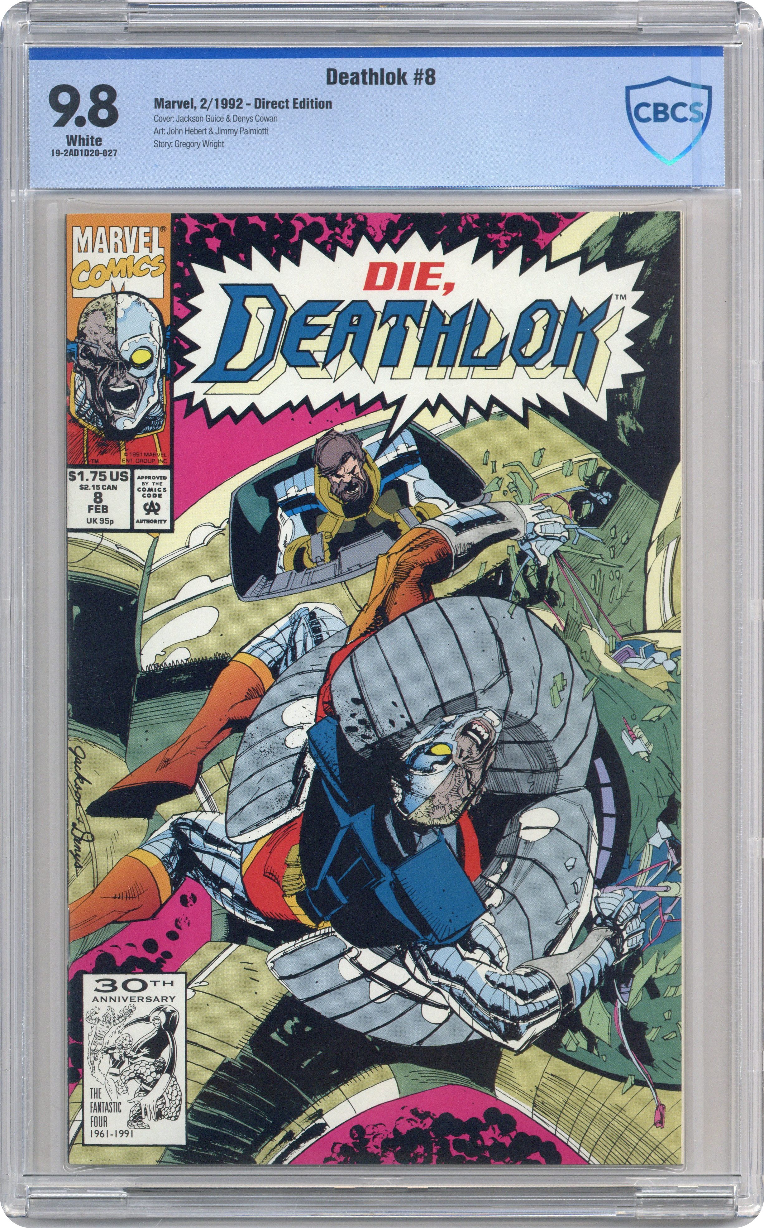 Ended Jun 27 2024 Winning Bid $16 Cover pencils by Jackson Guice, inks by Denys Cowan. The Ultimate War Machine, script by Gregory Wright, pencils by John Hebert, inks by Jimmy Palmiotti; Mainframe escapes from the Raft and fits Ben Jacobs with cybernetic body parts; The duo attack Deathlok in order to take control of his body; Deathlok manages to stave off the attack and the two villains escape. 36 pgs. $1.75. Cover price $1.75. Grade: CBCS 9.8 explanation of grade Condition: Used (collectible)