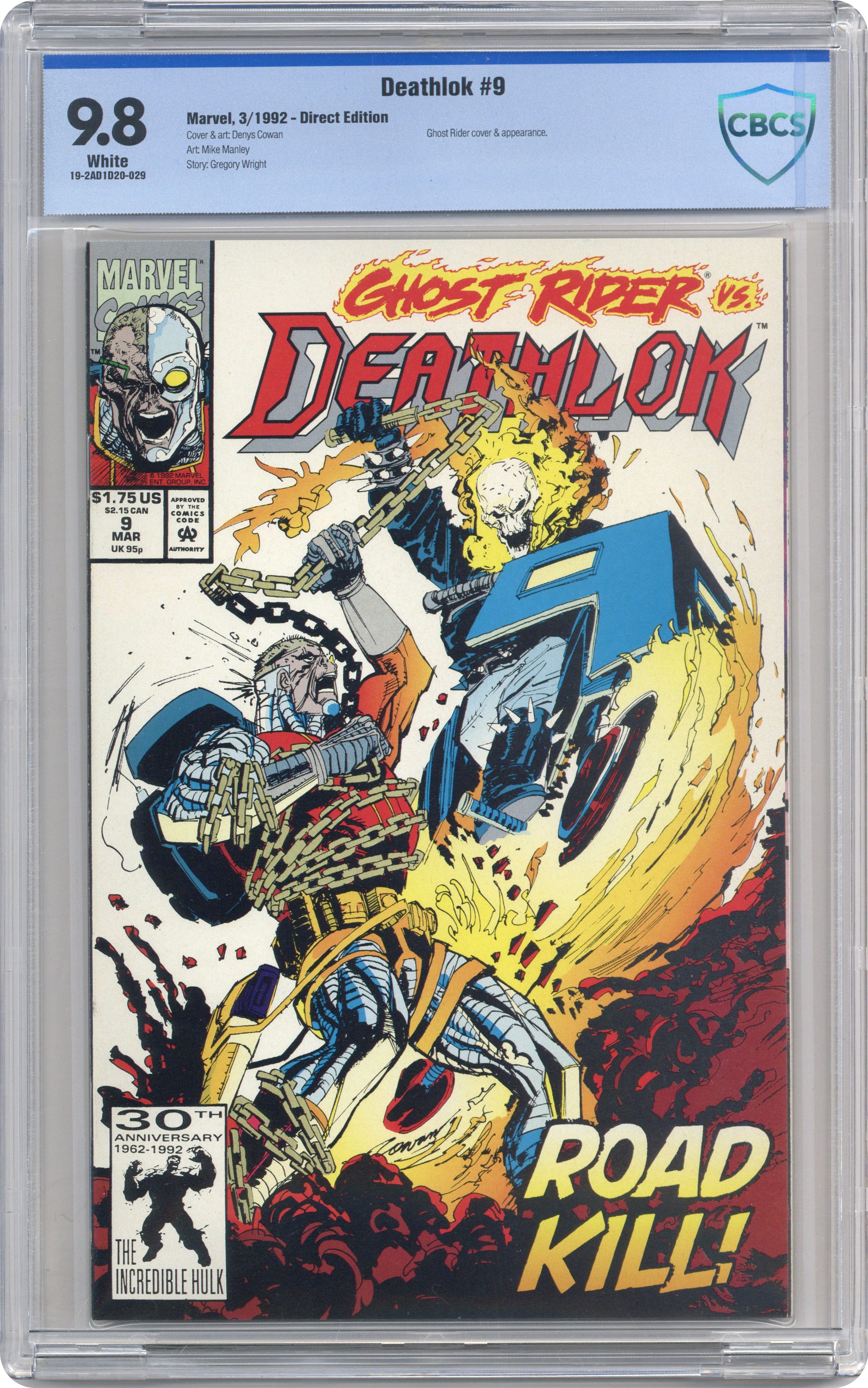 Cover art by Denys Cowan. Nightmares of Vengeance, script by Gregory Wright, pencils by Denys Cowan, inks by Mike Manley; Controlled by Nightmare, Deathlok goes on a rampage only to be confronted by the new Ghost Rider. 36 pgs. $1.75. Cover price $1.75. Grade: CBCS 9.8 explanation of grade Condition: Used (collectible)