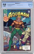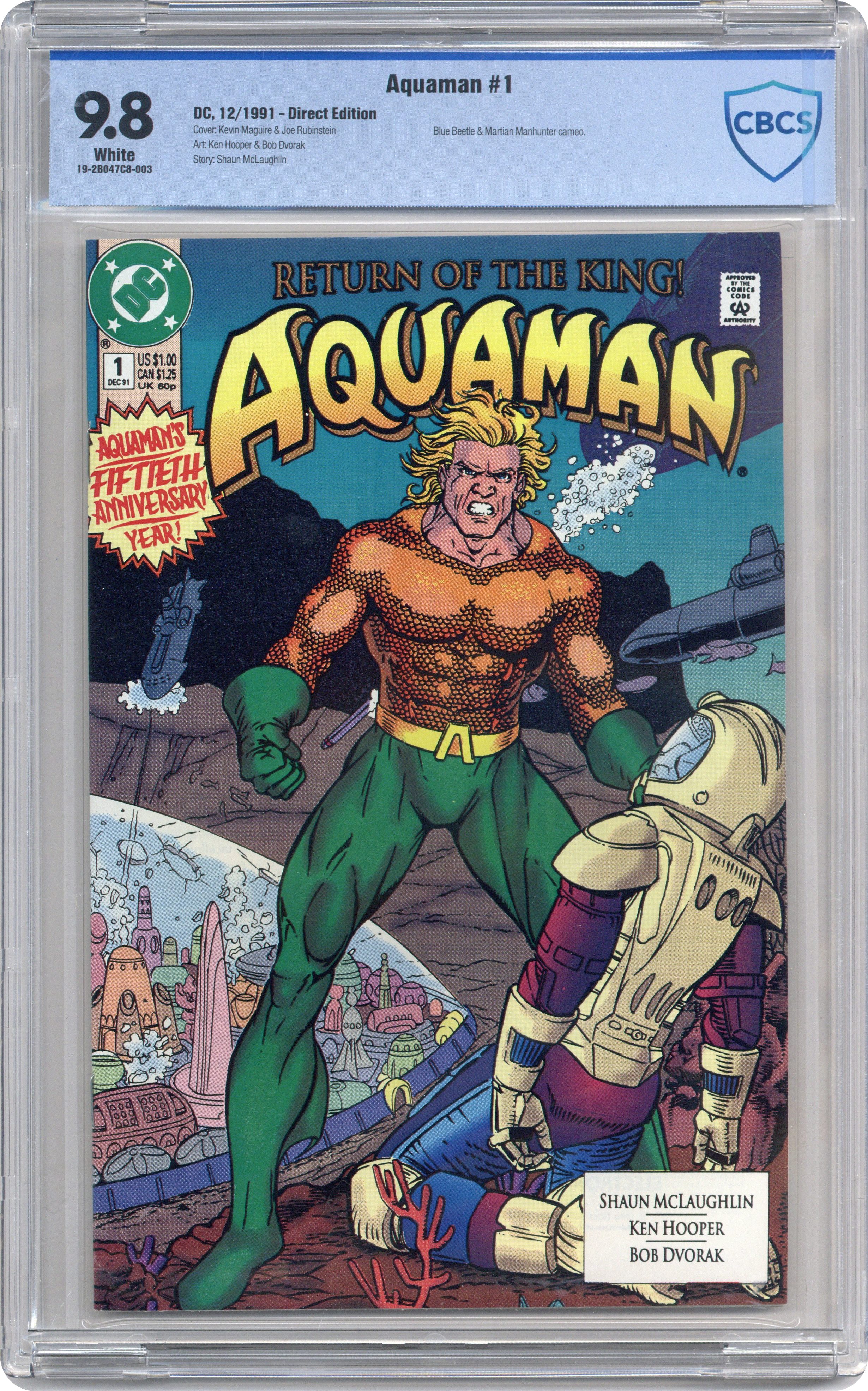 Aquaman's 50th Anniversary year! Aquaman has lost everything he holds dear - his wife, his child, his kingdom - and is now an obsessed man, driven by non-stop super-heroics as the 'King of the Seven Seas.' He's a man who keeps his pain inside, allowing his anger and sorrow to emerge in violent action. In this issue, Aquaman discovers Poseidonis is under attack and takes on an entire fleet of submarines single-handedly. Written by Shaun McLaughlin, with art by Ken Hooper and Bob Dvorak. Cover by Kevin Maguire and Joe Rubinstein. Cover price $1.00. Grade: CBCS 9.8 explanation of grade Condition: Used (collectible)