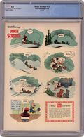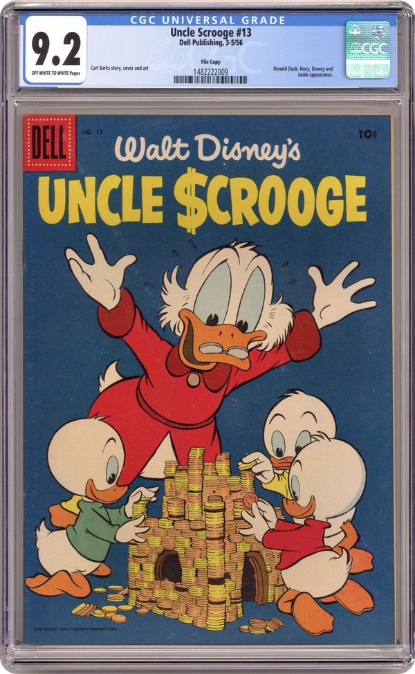 Cover by Carl Barks. Stories and art by Carl Barks. Comics legend Carl Barks creates his masterpiece, featuring the adventures of Donald Duck's Uncle Scrooge, the richest duck in the world. While trying to protect his money bin from earthquakes, Scrooge discovers a subterranean land, Terry Fermy. Exploring it with Donald and his nephews, they meet the creatures who cause earthquakes. This Carl Barks story was adapted into an episode of the beloved 1980s Disney cartoon show "Duck Tales." Gyro Gearloose finds a way to capture lightning and resell it. The Art of Security; Land Beneath the Ground!; All Washed-Up; Gyro Gearloose: Trapped Lightning. 32 pages, Full Color. Cover price $0.10. Grade: CGC 9.2 explanation of grade Condition: Used (collectible)