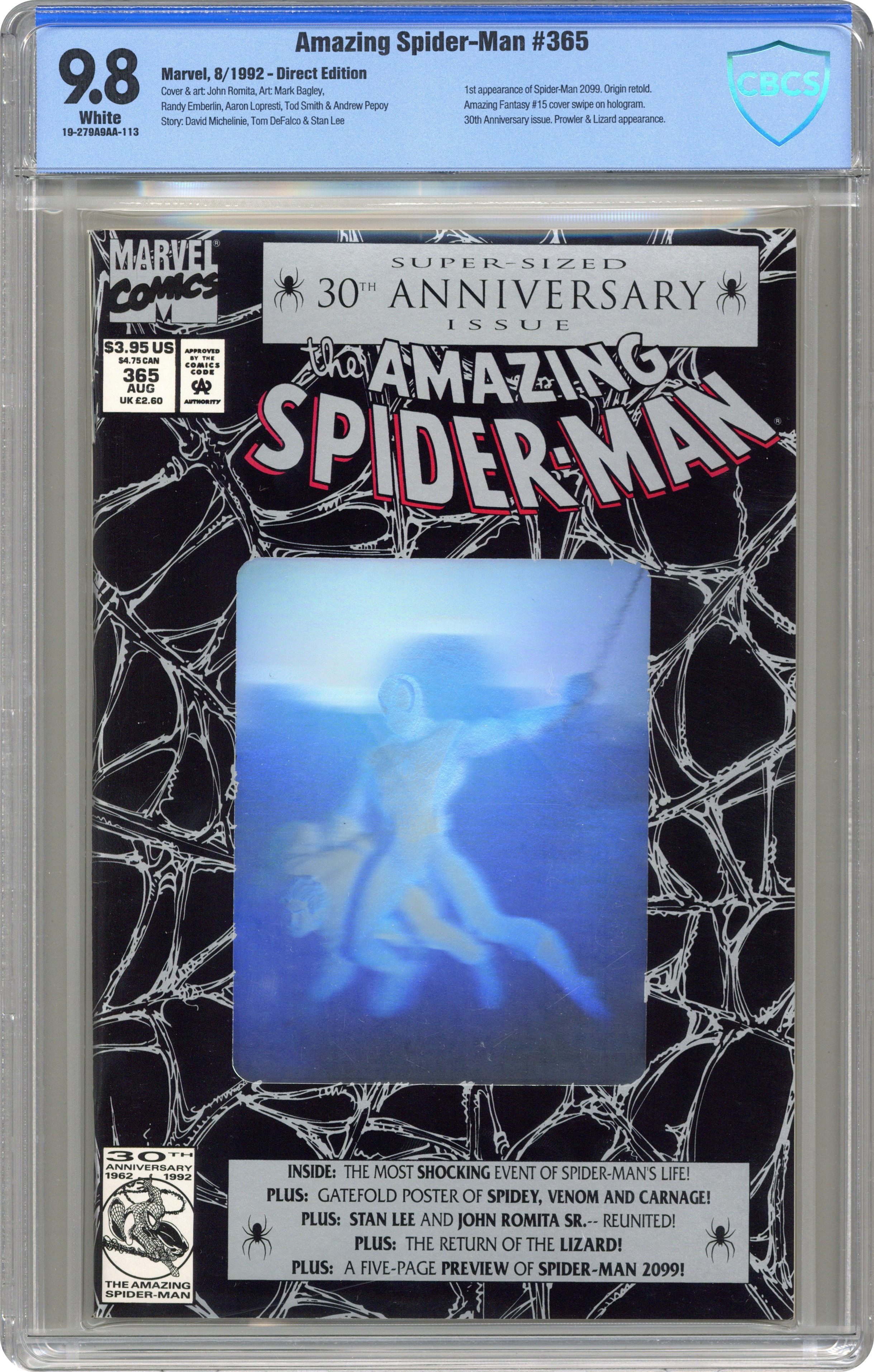 Ended Aug 6 2024 Winning Bid $69 Direct Edition. 80-page giant 30th Anniversary issue, with the first appearance of Spider-Man 2099! The Lizard returns in "Fathers and Sins." Script by David Michelinie, pencils by Mark Bagley, inks by Randy Emberlin. J. Jonah Jameson is featured in "How I Created Spider-Man!" Script by David Michelinie, art by Aaron Lopresti. Gwen Stacy takes center stage in "I Remember Gwen." Script by Stan Lee, plot by Tom DeFalco, art by John Romita Sr. (Cameos by the Green Goblin and Doctor Octopus.) The Prowler is also here in "A Friend in Need." Script by Tom DeFalco, pencils by Tod Smith, inks by Andrew Pepoy. There are also two text pieces, "The Saga of Spidey's Parents" by Stan Lee, and "Spider-Man: The First Thirty Years" by Peter Sanderson. Spider-Man 2099 gets a sneak preview, with a script by Peter David, pencils by Rick Leonardi, and inks by Al Williamson. This issue was originally released with a fold-out poster of Spidey versus Venom and Carnage (poster may be missing in lower grades). 84 pgs. Cover price $3.95. Grade: CBCS 9.8 explanation of grade Condition: Used (collectible)