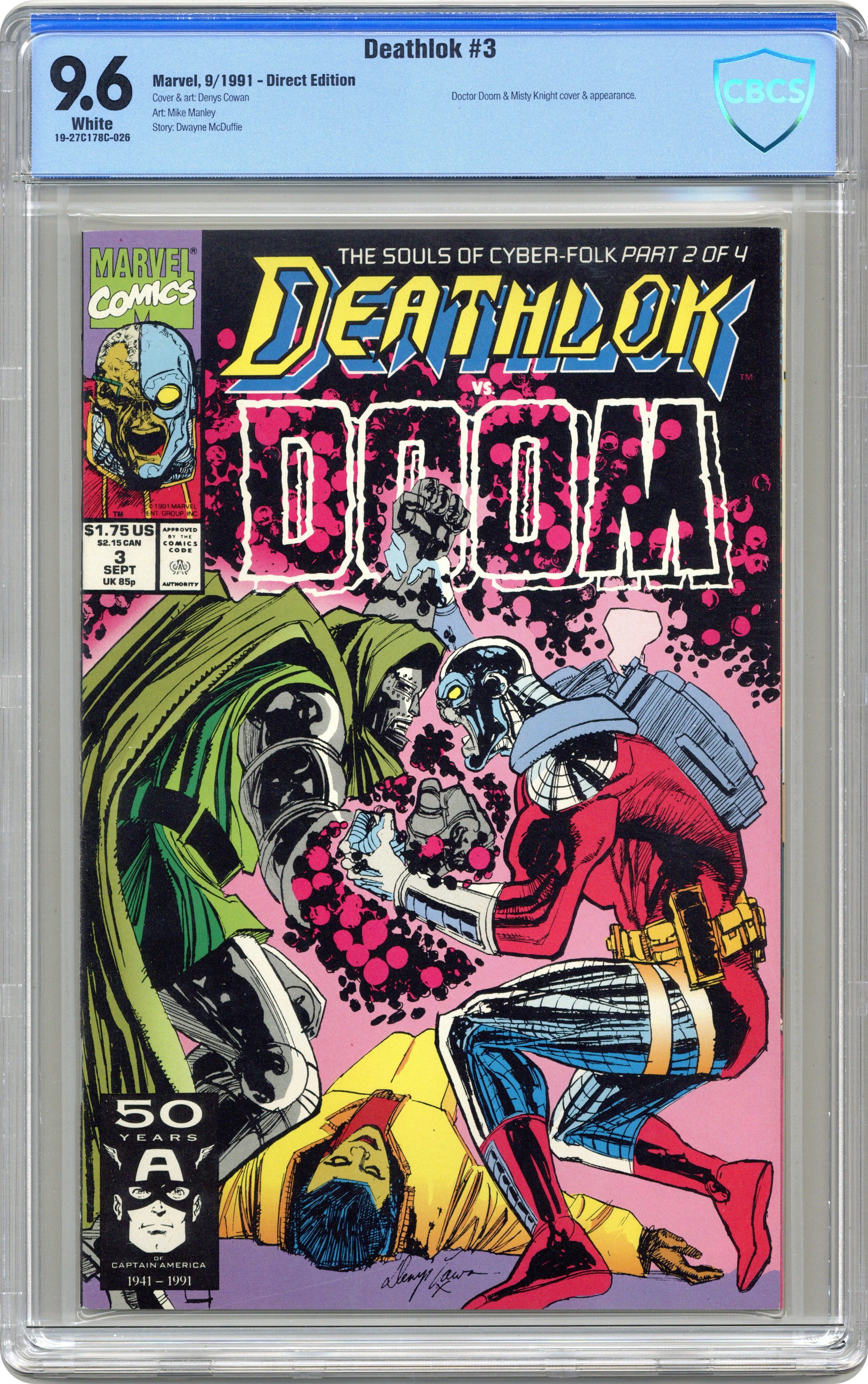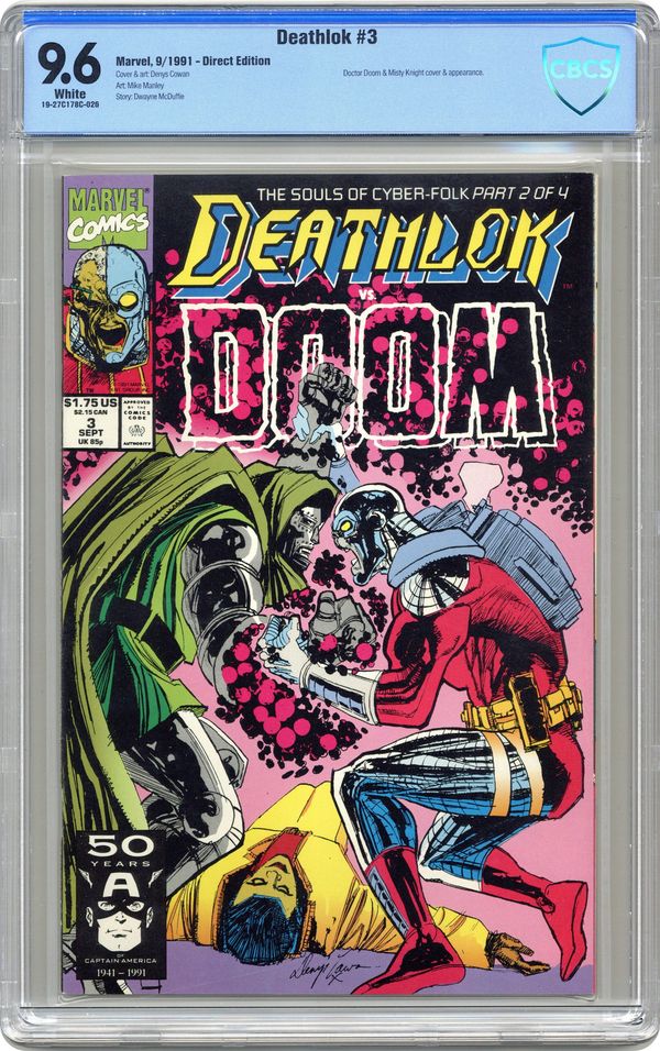 Ended Jun 19 2024 Winning Bid $18 Cover art by Denys Cowan. The Souls of Cyber-Folk Part 2: Impending Doom, script by Dwayne McDuffie, pencils by Denys Cowan, inks by Mike Manley; Deathlok and Misty Knight battle the Doombot masquerading as Dr. Doom. 36 pgs. $1.75. Cover price $1.75. Grade: CBCS 9.6 explanation of grade Condition: Used (collectible)