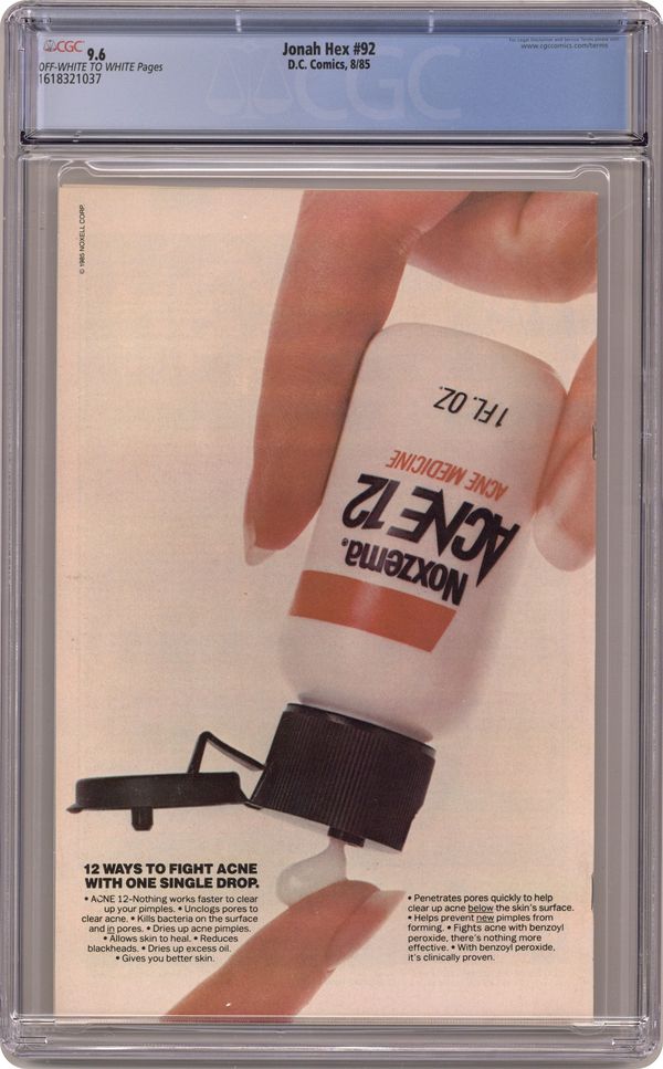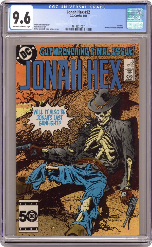 Direct Edition. In this last issue of Jonah Hex, Jonah goes out in "A Blaze of Glory!" Hex faces off with villains in the West when he suddenly disappears from the late 1880's and reappears in the 21st century sometime after a nuclear war. Continues in Hex (1985) #1. Written by Michael Fleisher, with art by Gray Morrow. Cover by Denys Cowan and Klaus Janson. Cover price $0.75. Grade: CGC 9.6 explanation of grade Condition: Used (collectible)