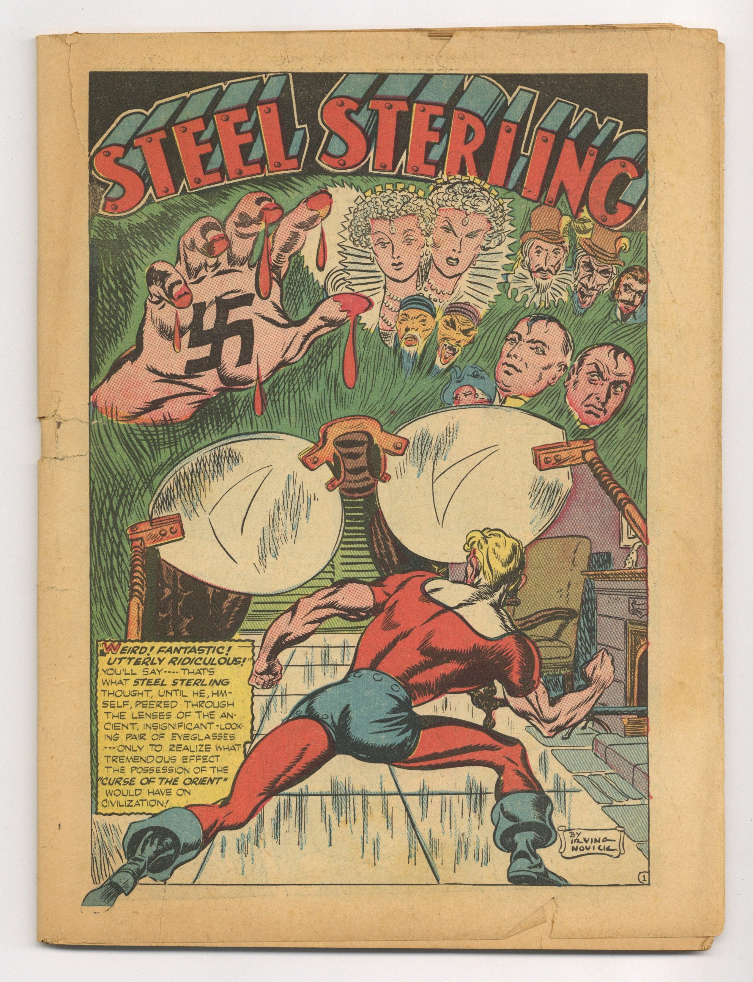Edited by Harry Shorten. Cover pencils by Harry Shorten. "Curse of the Orient," art by Irv Novick; Story involving a pair of eyeglasses called the Curse of the Orient, which can reveal the true inner thoughts of the person looked at. "Drums of Madness," art by Sam Burlockoff; A diplomat hears drums inside his head, and it drives him almost insane; Web finds out he has a miniature receiver operated into his teeth. "The Professor Dies" text story by Scott Feldman. "The Full House," art by Sam Cooper; With the ever-increasing U-boat menace at work day and night along the shores, America's life lines of supply are threatened with extinction; Black Jack finds one of the spies and informers in a casino. "Commando Training," art by Red Holmdale; Wilbur is practicing to become a commando. "The Nazi Cobra Reinhardt Heydrich"; Life history of one of the world's most vicious monsters. "Michael O'Conner," art by Johnson; The story of an Irish cab driver from Brooklyn who drove supply trucks in Burma. "Rumor Mongers," art by Paul Reinman; All they did was spread a little rumor that was big enough to cause the sinking of a ship. 68 pgs., full color. Cover price $0.10. Grade: Coverless explanation of grade Condition: Used (collectible)