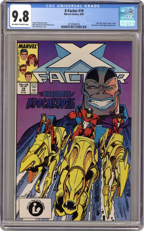 "All Together Now!" Story by Louise Simonson. Art by Walter Simonson and Bob Wiacek. Can X-Factor survive the first attack of the Horsemen of Apocalypse? Meet War, Famine, and Pestilence...hope they survive the experience. Cover price $0.75. Grade: CGC 9.8 explanation of grade Condition: Used (collectible)