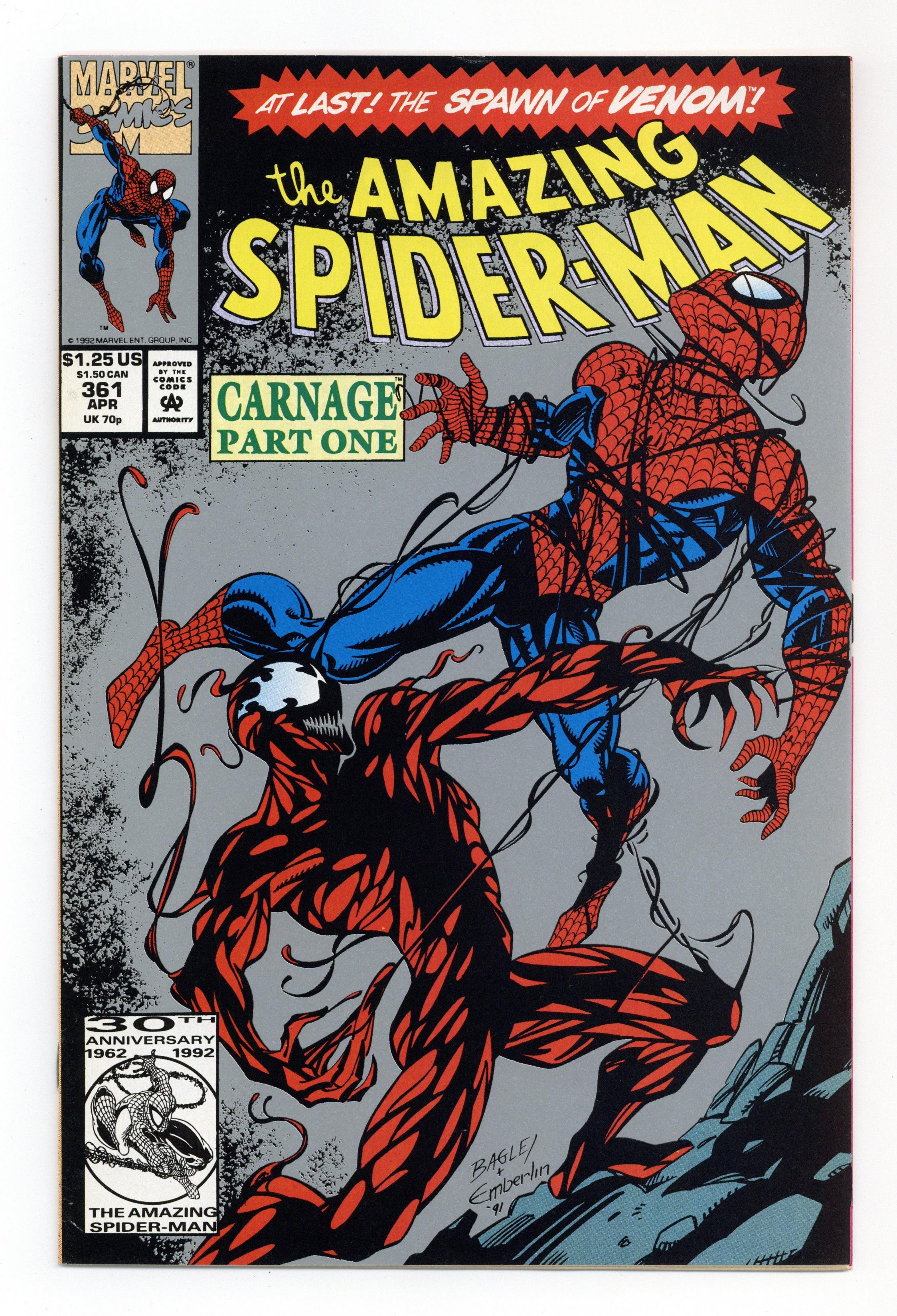 Ended Sep 24 2024 Winning Bid $31 Second Printing (silver ink background, not white); 1st full app Carnage in "Savage Genesis!" Pt. 1 of 3. Script by David Michelinie. Pencils by Mark Bagley. Inks by Randy Emberlin. Cover by Mark Bagley and Randy Emberlin. Blood runs in the streets as a serial killer roams New York City! And as the web-slinger investigates the murders, he notices a very disturbing similarity to another killer's modus operandi! In a burned-out building in Brooklyn, the spectacular one comes face-to-face with his new homicidal foe...Carnage! Can the wall-crawler end Cletus Kasady's rampage in their very first encounter? Cameo appearances by Aunt May and Mary Jane Watson. Flashback cameo by Venom. 36 pgs. Cover price $1.25. Grade: VF 8.0 explanation of grade Condition: Used (collectible)