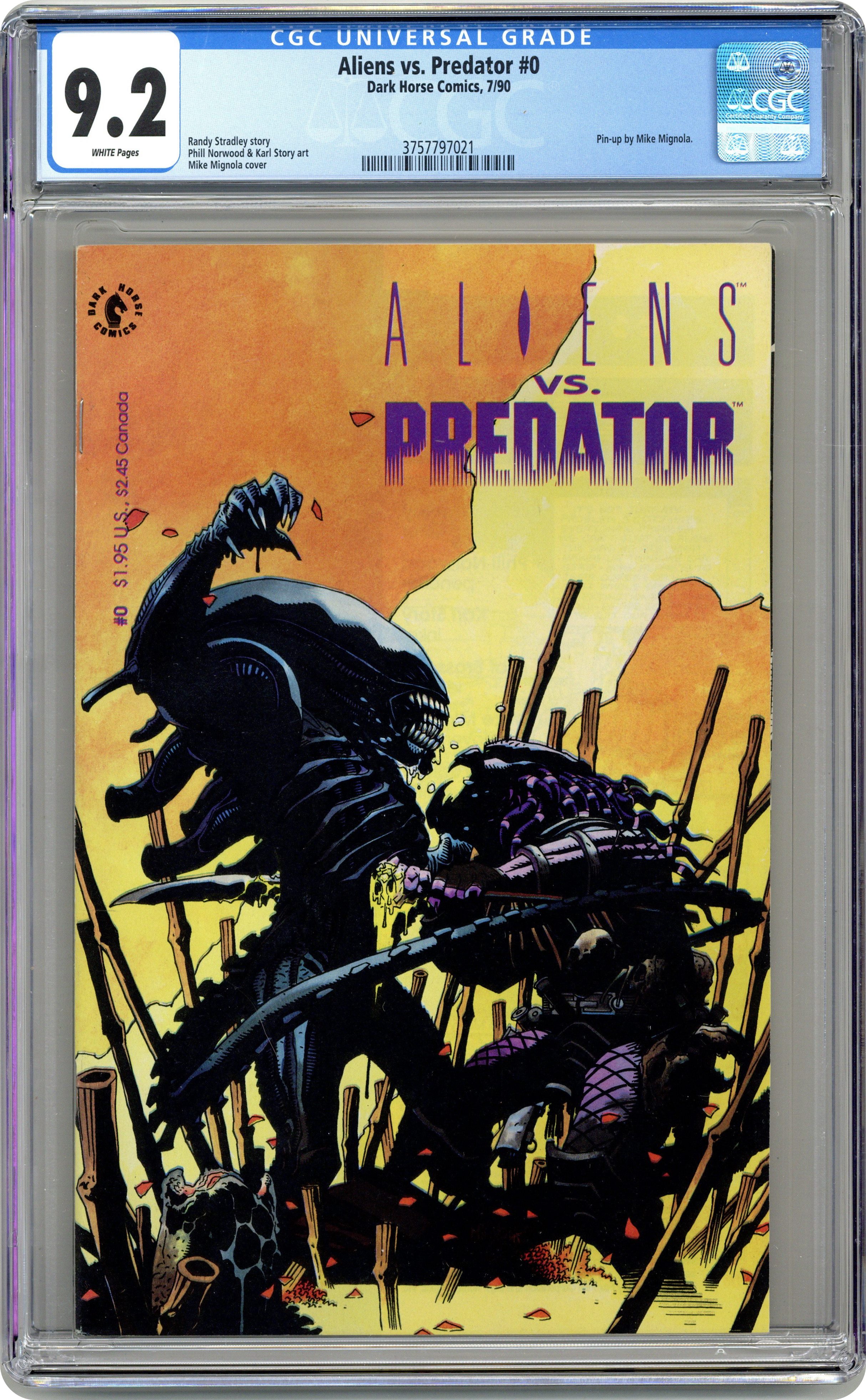 Collecst the Aliens vs. Predator Prequel story from Dark Horse Presents #34-#36 - Written by Randy Stradley. Art by Phill Norwood and Karl Story. Cover by Mike Mignola Originally published in three installments in Dark Horse Presents, this edition collects the blockbuster "prequel" tale written by Randy Stradley and illustrated by Phillip Norwood. This storyline takes place prior to events contained in the Aliens vs. Predator four-issue, full-color series. 32 pages, FC. Cover price $1.95. Grade: CGC 9.2 explanation of grade Condition: Used (collectible)