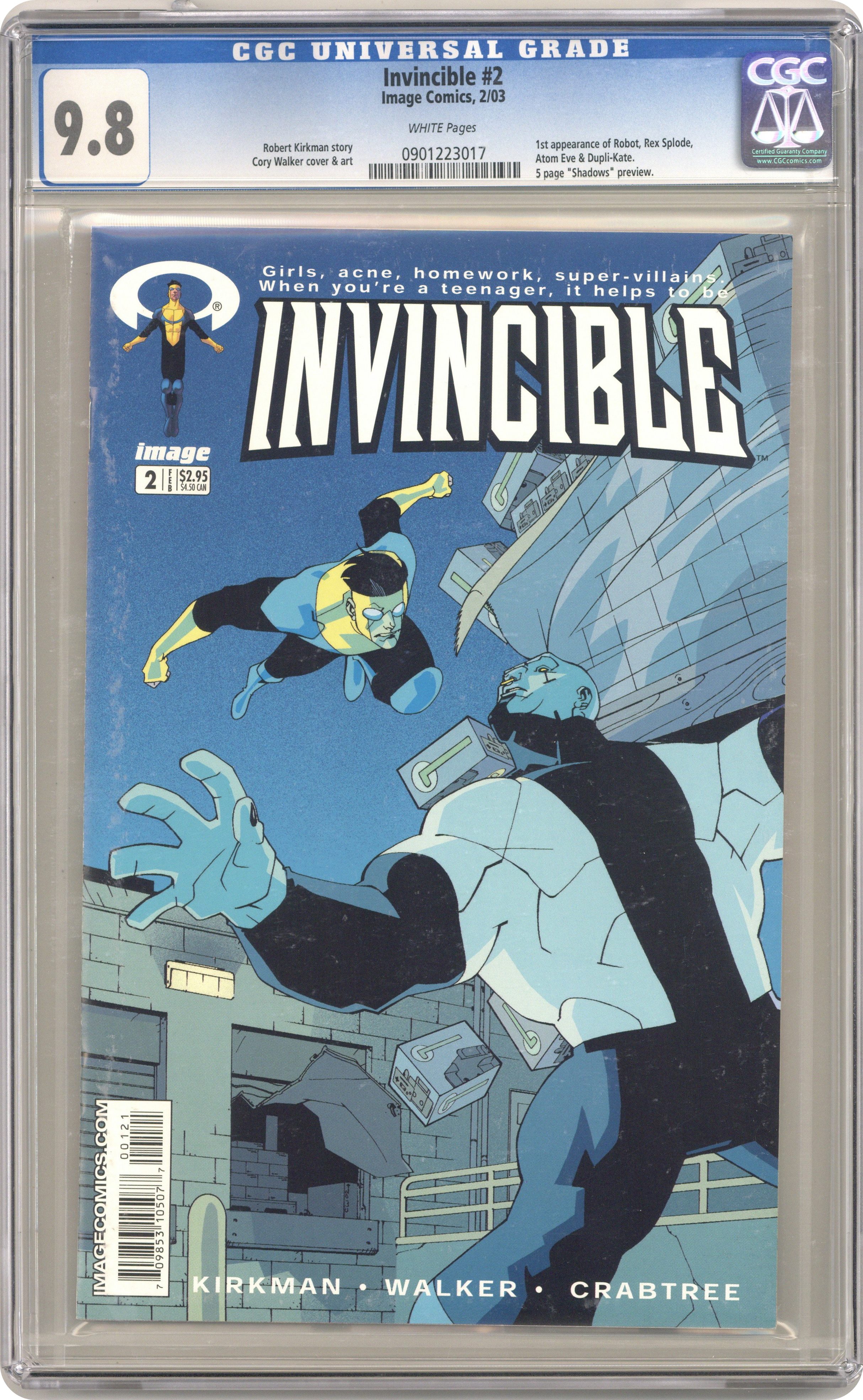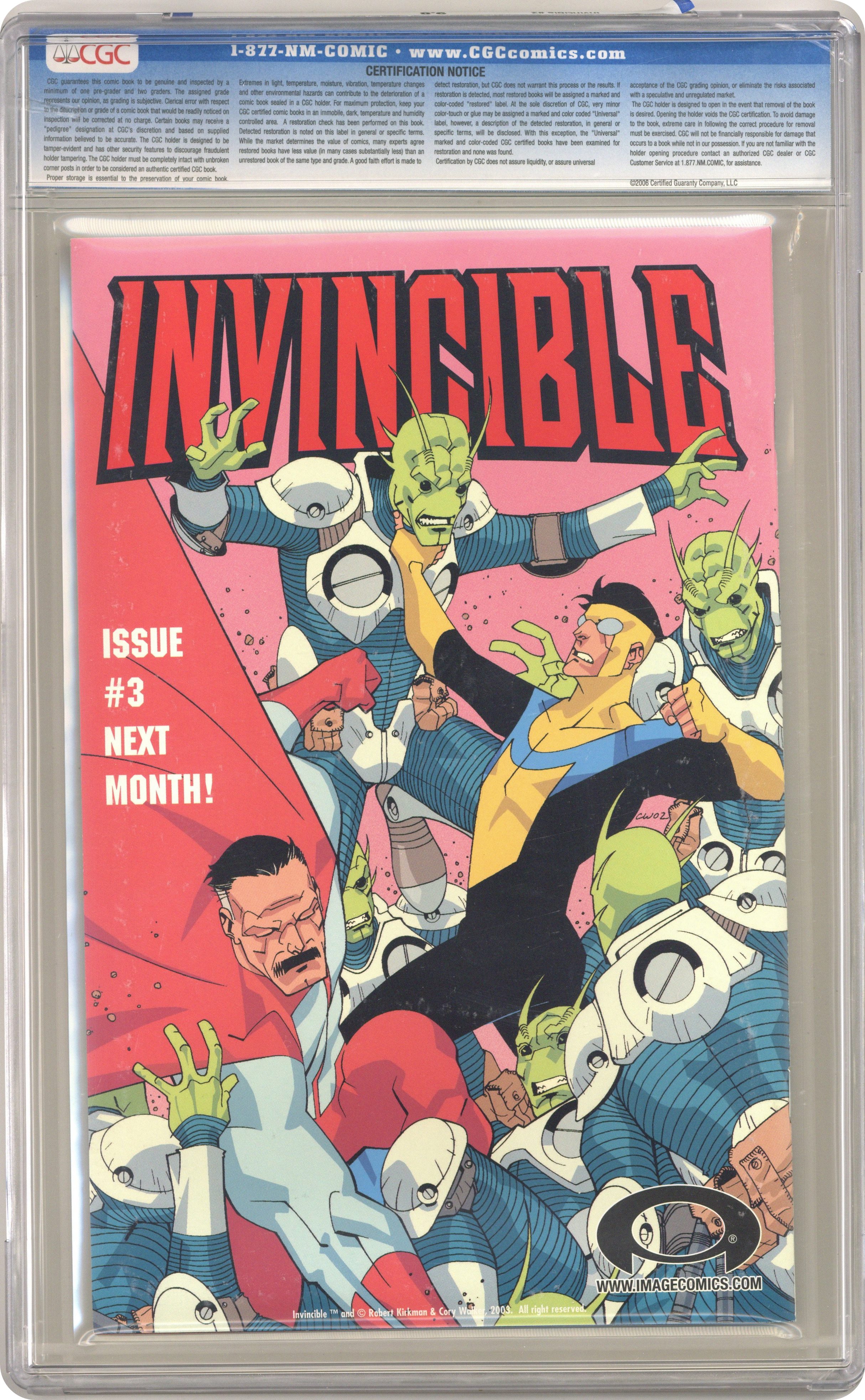 (W) Robert Kirkman (A) Cory Walker (Cover) Cory Walker & Bill Crabtree In stores the week of February 12th. The Concept: Mark Grayson is just like most everyone else his age. He's a senior at a normal American high School. He has a crappy part time job after school and on weekends. He likes girls quite a bit, but doesn't quite understand them. He enjoys hanging out with his friends, and sleeping late on Saturdays, at least until the good cartoons come on. The only difference between Mark and everyone else, is that his father is the most powerful superhero on the planet, and as of late, he seems to be inheriting his father's powers. Which sounds okay at first, but how do you follow in your father's footsteps when you know you will never live up to his standards? This Issue: Mark has come down with a case of insomnia, and while most people would trot down to the living room to watch infomercials, Mark, being a superhero, has a few more entertaining options. During his leisurely evening flight, he spots a robbery in progress at the local Toys R Toys. But why would a villain like the dreaded Ogre want to steal an entire shipment of Game Boxes? And why is the world's premier teenaged super team on hand to help Invincible stop him? And when did that girl in 3rd period science class get so cute? Nothing is what it seems, and everything seems like it's nothing, but one thing's for sure, it's entertaining as all get out! FC, 32pp $2.95 Ongoing monthly series Cover price $2.95. Grade: CGC 9.8 explanation of grade Condition: Used (collectible)