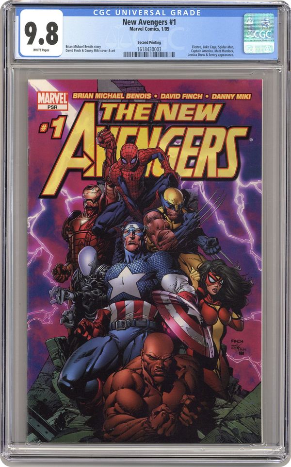 2nd Printing Finch Cover - Written by Brian Michael Bendis Pencils & cover by David Finch "NEW AVENGERS" PART 1 (OF 5). After the Devasting destruction of the orginal Avengers just what sort of threat to the world could persuade Captain America to assemble an all-new team? And after the events of AVENGERS DISASSEMBLED, who could possibly be on this team? How does Cap, Iron Man, Spider-Man & Wolverine sound? Get ready for the first of a proposed 500-issue run that signals an all-new era, as Bendis & Finch joins with you, the fervent faithful, for the launch of the all-new ongoing Avengers series! 32 PGS./ MARVEL PSR Cover price $2.25. Grade: CGC 9.8 explanation of grade Condition: Used (collectible)