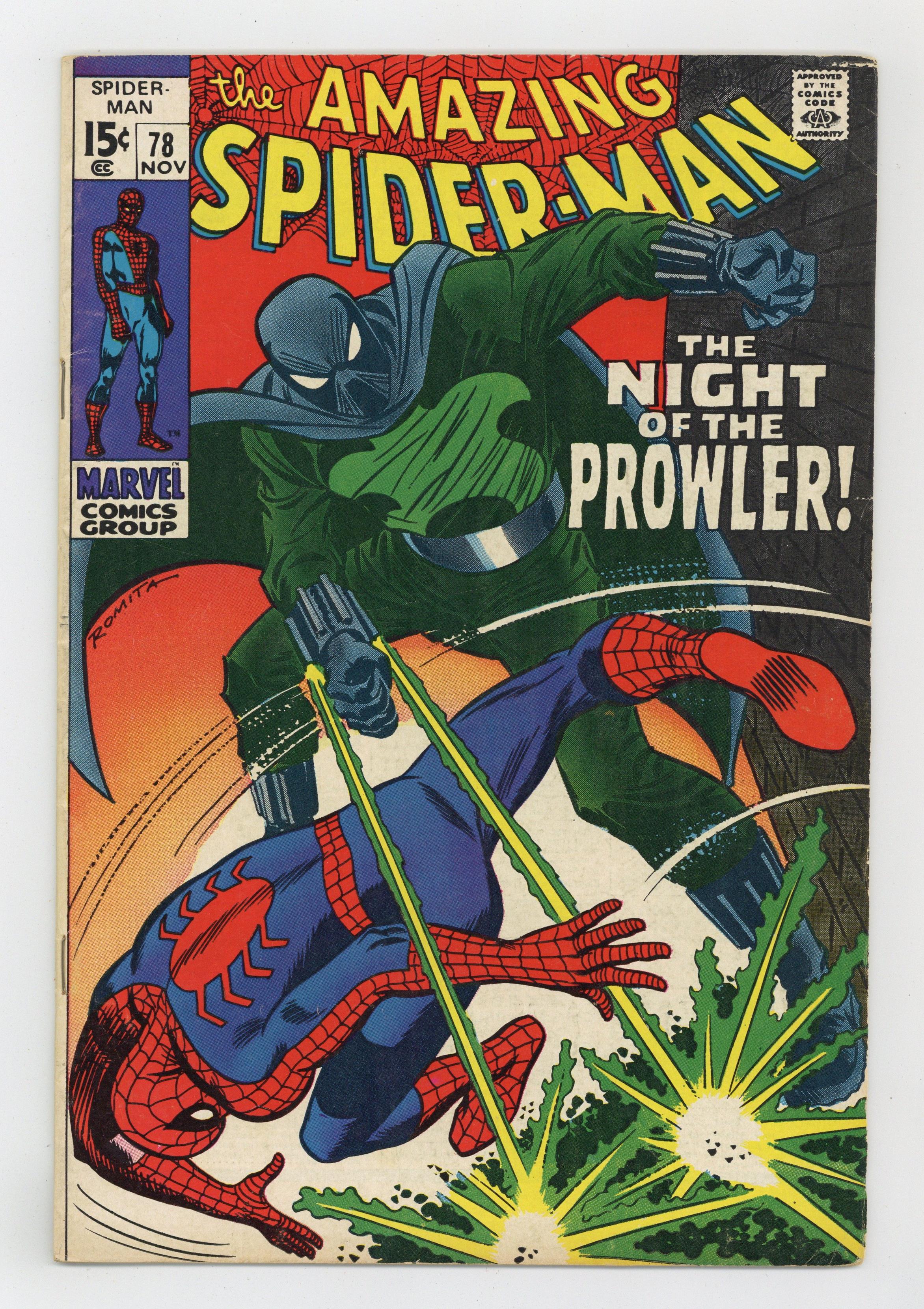 First appearance of the Prowler in "The Night of the Prowler!" Part 1 of 2. Script by Stan Lee. Art by John Buscema (layouts) and Jim Mooney (finishes). Cover by John Romita. In order to make a name for himself, a down on his luck window washer named Hobie Brown becomes a super-villain. And using his own ideas and equipment, Hobie creates weapons and a costume -- and the Prowler is born! In the meantime, Peter Parker is also feeling downtrodden after seeing Gwen Stacy and Flash Thompson having coffee together. Later that evening, Peter stops by the Daily Bugle hoping for a payday advance. But instead he sees the Prowler stealing the Bugle's payroll bag! And suddenly it's the Prowler vs. Peter Parker...with J. Jonah Jameson standing by! Origin of the Prowler. Cameo appearances by Harry Osborn, Joe Robertson, and Mindy Brown. (Note: This story was reprinted in Marvel Tales #59.) 36 pages. Cover price $0.15. Grade: VG 4.0 explanation of grade Condition: Used (collectible)