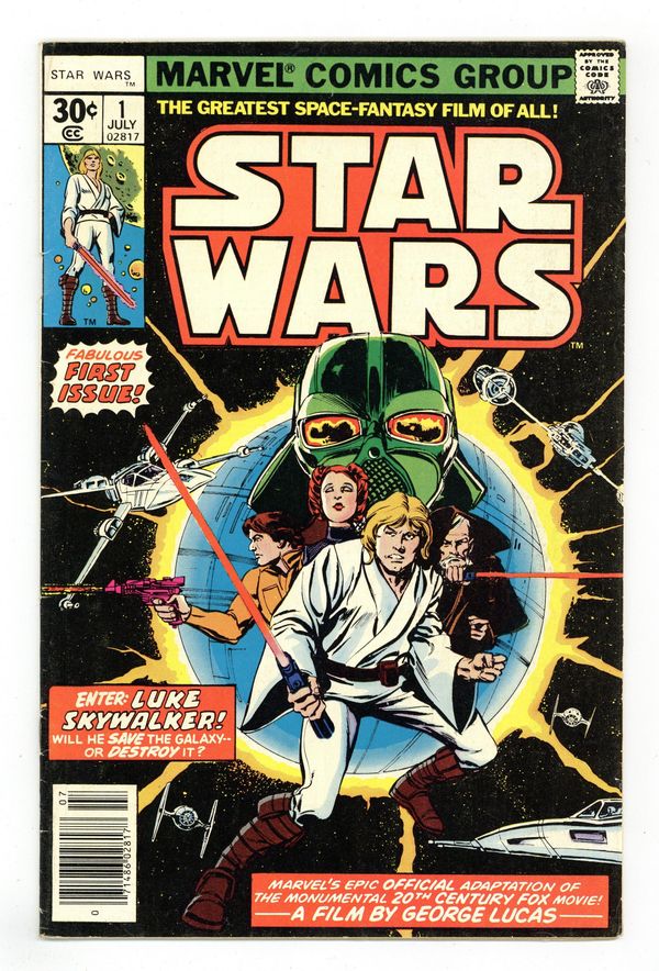 A Long time ago, in a galaxy far, far away...the galaxy is engrossed in an intergalactic civil war. A small band of freedom fighters led by Princess Leia opposes the evil Galactic Empire and steals the plans to their most destructive weapon, the Death Star. Darth Vader, the most feared name in the galaxy, will stop at nothing to recover those stolen plans and the location of the Rebel's secret base of operations. Now, it's up to farm boy Luke Skywalker and a motley band of heroes to save the Princess and the galaxy from the darkness that has engulfed it. Cover price $0.30. Grade: FN- 5.5 explanation of grade Condition: Used (collectible)If you add this item to your want list, we will email you when it becomes available.