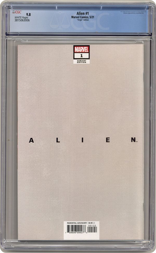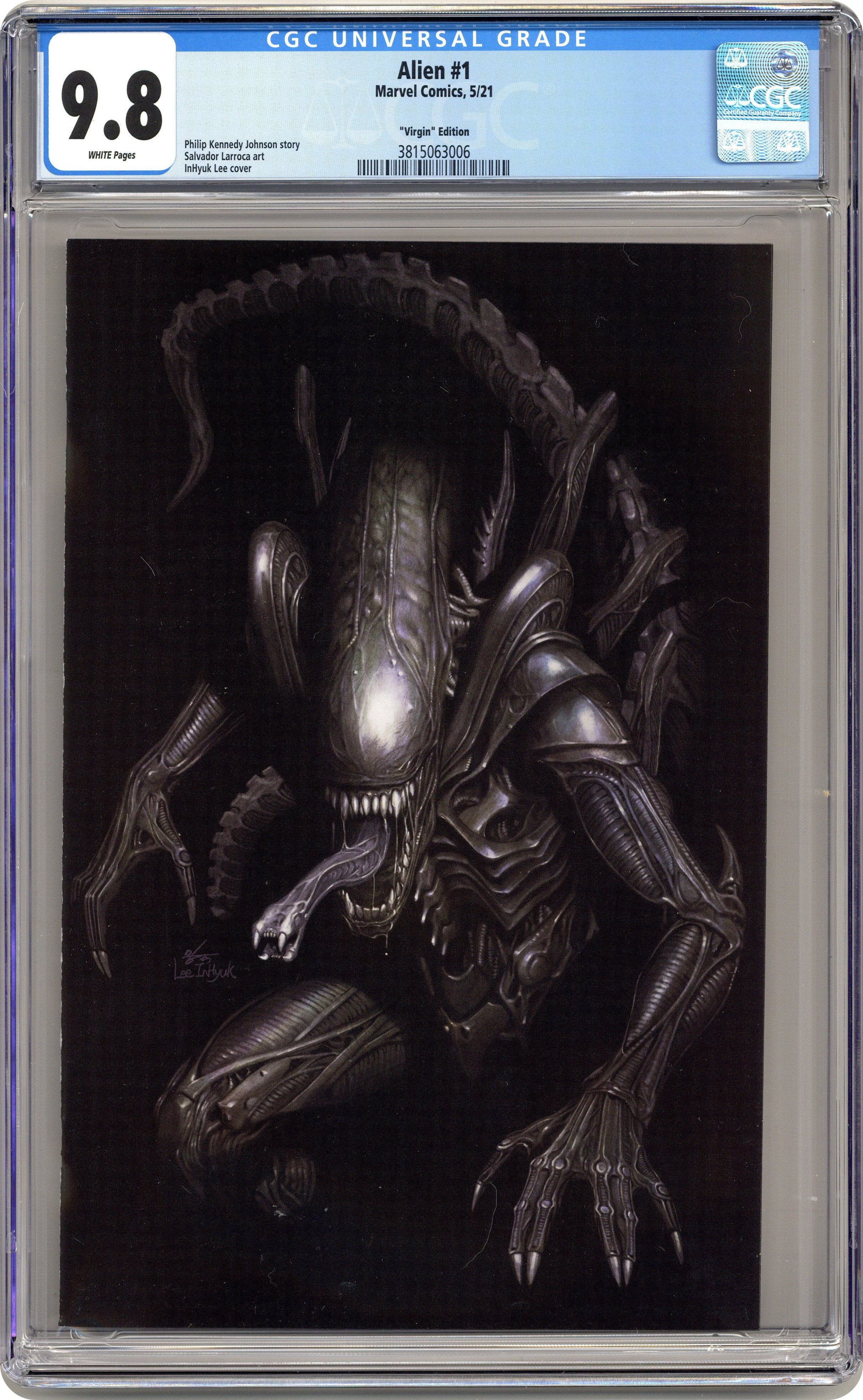 Limited 1 for 500 Retailer Incentive Variant Cover. Written by Phillip Kennedy Johnson. Art by Salvador Larroca. Cover by Inhyuk Lee. THE ICONIC CINEMATIC TERROR MAKES ITS MARVEL DEBUT! Gabriel Cruz gave his life to Weyland-Yutani--In the case of an alien attack he barely survived, almost literally! Recently retired, Cruz is trying to patch things up with his abandoned son with the help of his friend, a Bishop-model android, but his re-entry into civilian life is not going smoothly…and his encounters with the deadly Xenomorph are far from over. Phillip Kennedy Johnson and Salvador Larroca team up to tell an all-new tale of the titan of horror and science fiction that has scared audiences for decades. No one is safe. No one is innocent. And no one can hear you scream. 40 pages, full color. Parental Advisory Cover price $4.99. Grade: CGC 9.8 explanation of grade Condition: Used (collectible)