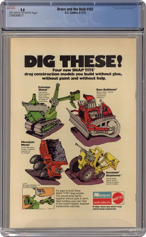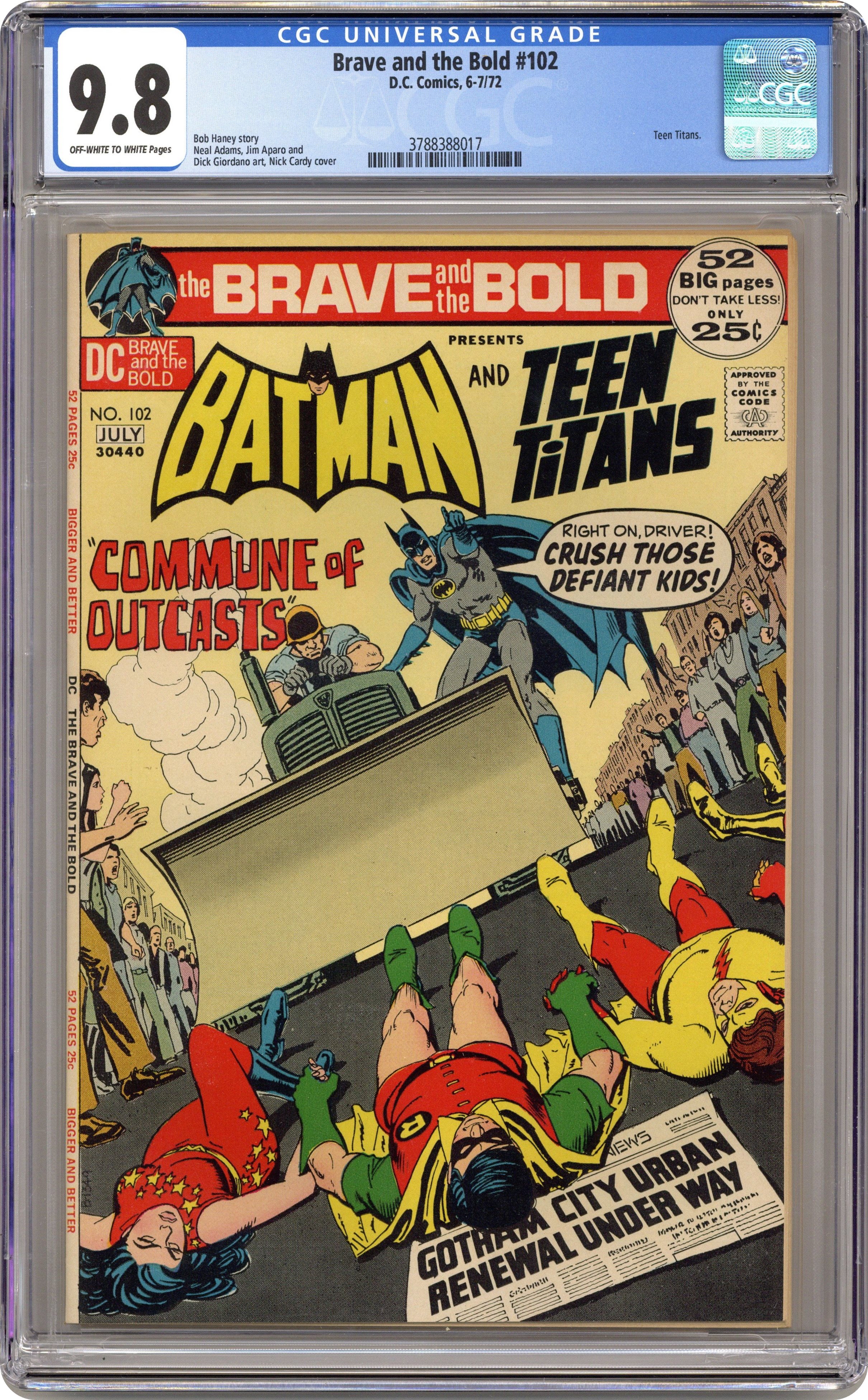 Giant-size issue. Cover by Nick Cardy. "The Commune of Defiance," script by Bob Haney, pencils by Jim Aparo (pages 1-13), Neal Adams (pages 14-21), and Dick Giordano (page 22), inks by Jim Aparo (pages 1-13) and Dick Giordano (pages 14-22); Batman recruits the Teen Titans to help defuse an explosive confrontation between Gotham City's "Establishment" and the Young Aquarians, a group of young citizens inhabiting a crime-ridden neighborhood; The situation is complicated by an internal struggle for control of the neighborhood, fought between a local crime boss and the Young Aquarians. Reprint story from The Doom Patrol #100: "The Robot-Maker Must Die" starring Robotman, The Chief, Elasti-Girl, and Negative Man, script by Arnold Drake, art by Bruno Premiani. Letter to the editor from comic editor Bob Rozakis. 52 Pages, Full Color. Cover price $0.25. Grade: CGC 9.8 explanation of grade Condition: Used (collectible)