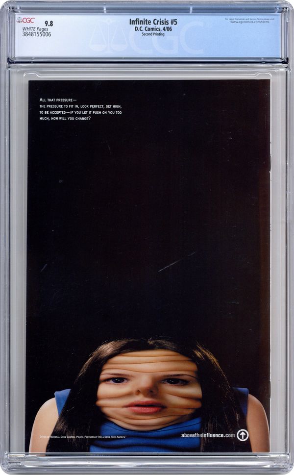 Ended Oct 18 2023 Winning Bid $30 George Perez Sketch Cover - Written by Geoff Johns Art by Phil Jimenez & Andy Lanning. Covers by Jim Lee & Sandra Hope and George Pérez. 1st costumed appearance of the third Blue Beetle. (for 1st appearance as Jaime Reyes, see Infinite Crisis #3). The DCU shakes apart as Superman of Earth 2 finally confronts our Superman. Meanwhile, heroes are disappearing throughout the DC Universe, a transformed villain returns, and the mystics of every world and dimension seek help from the very Spirit that is destroying them. Retailers please note: This issue will ship with covers by Lee & Hope (approximately 50%) and Pérez (approximately 50%). On sale February 15 ? 5 of 7 ? 40 pg, FC, $3.99 US Cover price $3.99. Grade: CGC 9.8 explanation of grade Condition: Used (collectible)