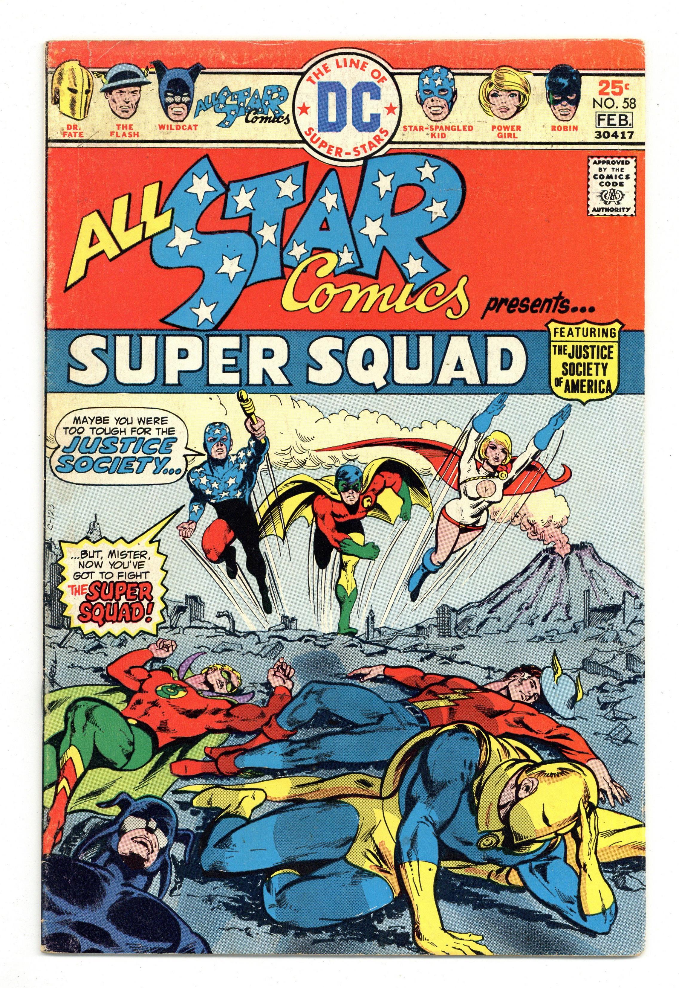 1st appearance of Power Girl. Cover art by Mike Grell. The Super Squad! starring the All Star Super Squad, script by Gerry Conway, pencils by Ric Estrada, inks by Wally Wood; Power Girl describes the Super Squad as a strike force composed of the JSA and the three younger heroes--Robin, Power Girl, and Star-Spangled Kid. Letters from Roy Thomas and Jerry Bails. The Captive Commissioner Hostess ad starring Batman, pencils by Curt Swan, inks by Vince Colletta. 36 Pages, Full Color. Cover price $0.25. Grade: VG+ 4.5 explanation of grade Condition: Used (collectible)