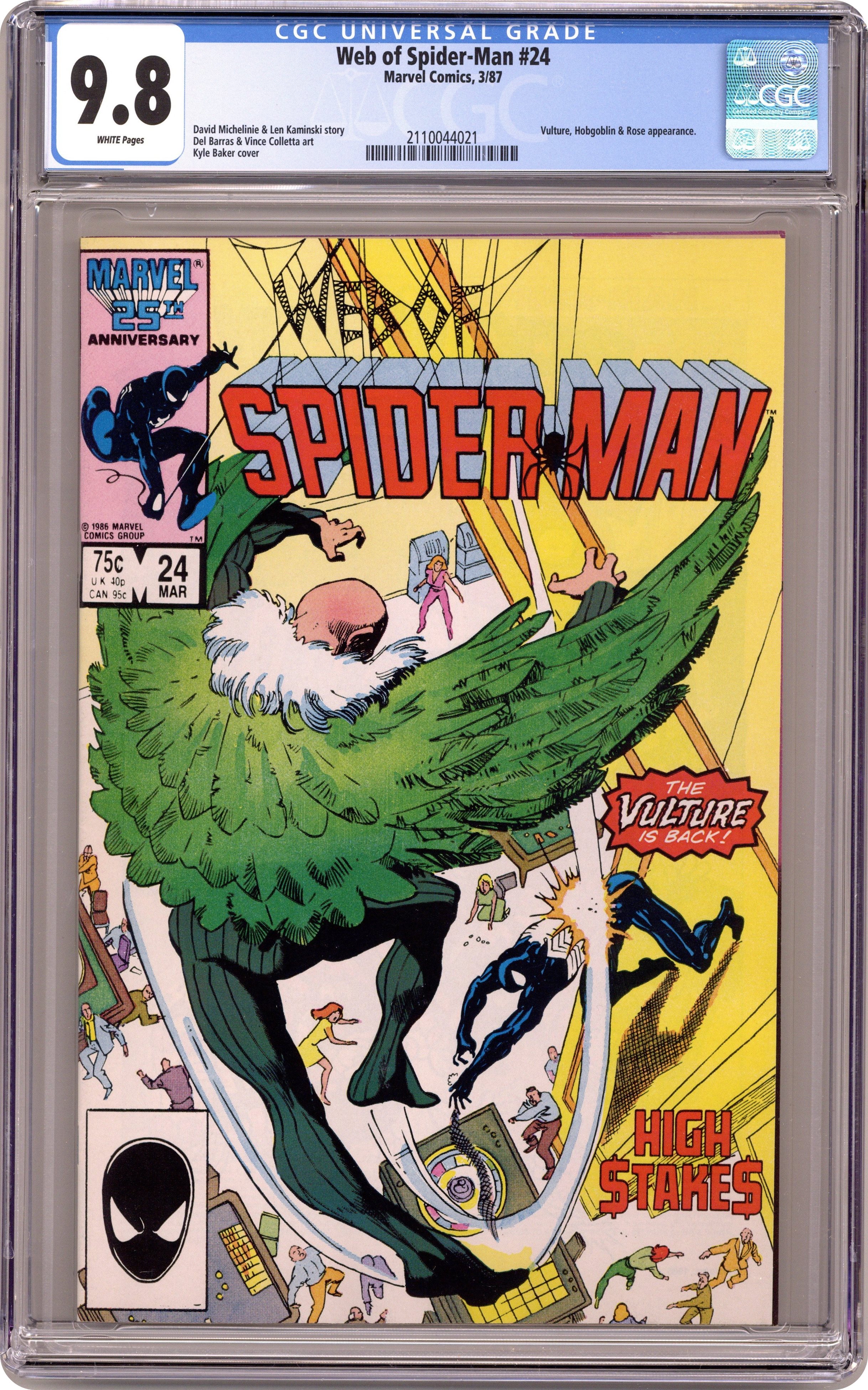 Direct Edition. "High $take$" Story by David Michelinie and Len Kaminski. Art by Del Barras and Vince Colletta. Aunt May, Nathan Lubensky, and Peter Parker are in Atlantic City, and Nathan is gambling heavily again. The Vulture attempts to blackmail the casino, but to do so the aging villain must first defeat Spider-Man...and then the Hobgoblin? Cameo appearance by the Rose. 32 pages Cover price $0.75. Grade: CGC 9.8 explanation of grade Condition: Used (collectible)