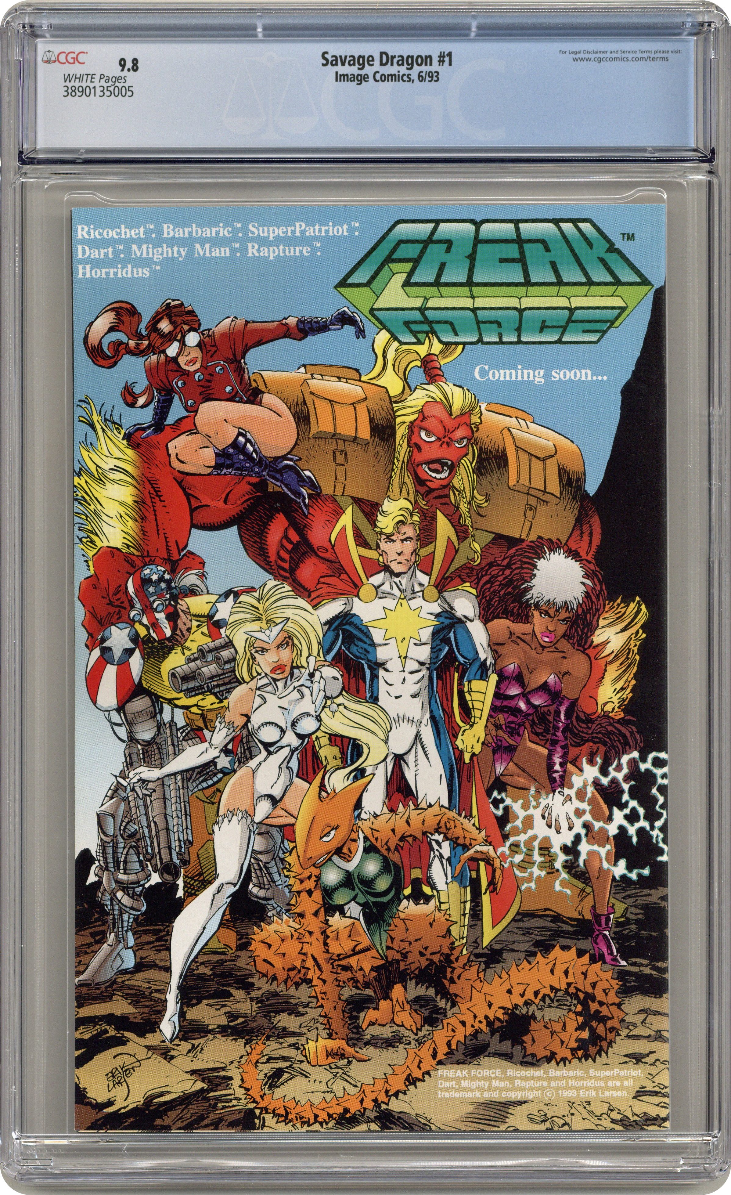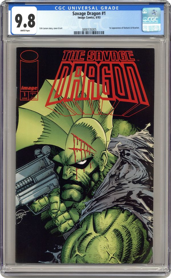 "The Savage Dragon!" Story and art by Erik Larsen. In a city where the bad guys are bulletproof (literally), only one man has the power to fight back. Found in a burning field with no memory of his past, the Savage Dragon fights on the side of justice as an officer of the Chicago Police Department against the sinister mutants and super villains of the criminal organization known as the Vicious Circle. But in the startling aftermath of the his first series' event, the Dragon may not be in any shape to fight. 32 pages, FC. NOTE: 1st appearance of Barbaric and Ricochet. Cover price $1.95. Grade: CGC 9.8 explanation of grade Condition: Used (collectible)