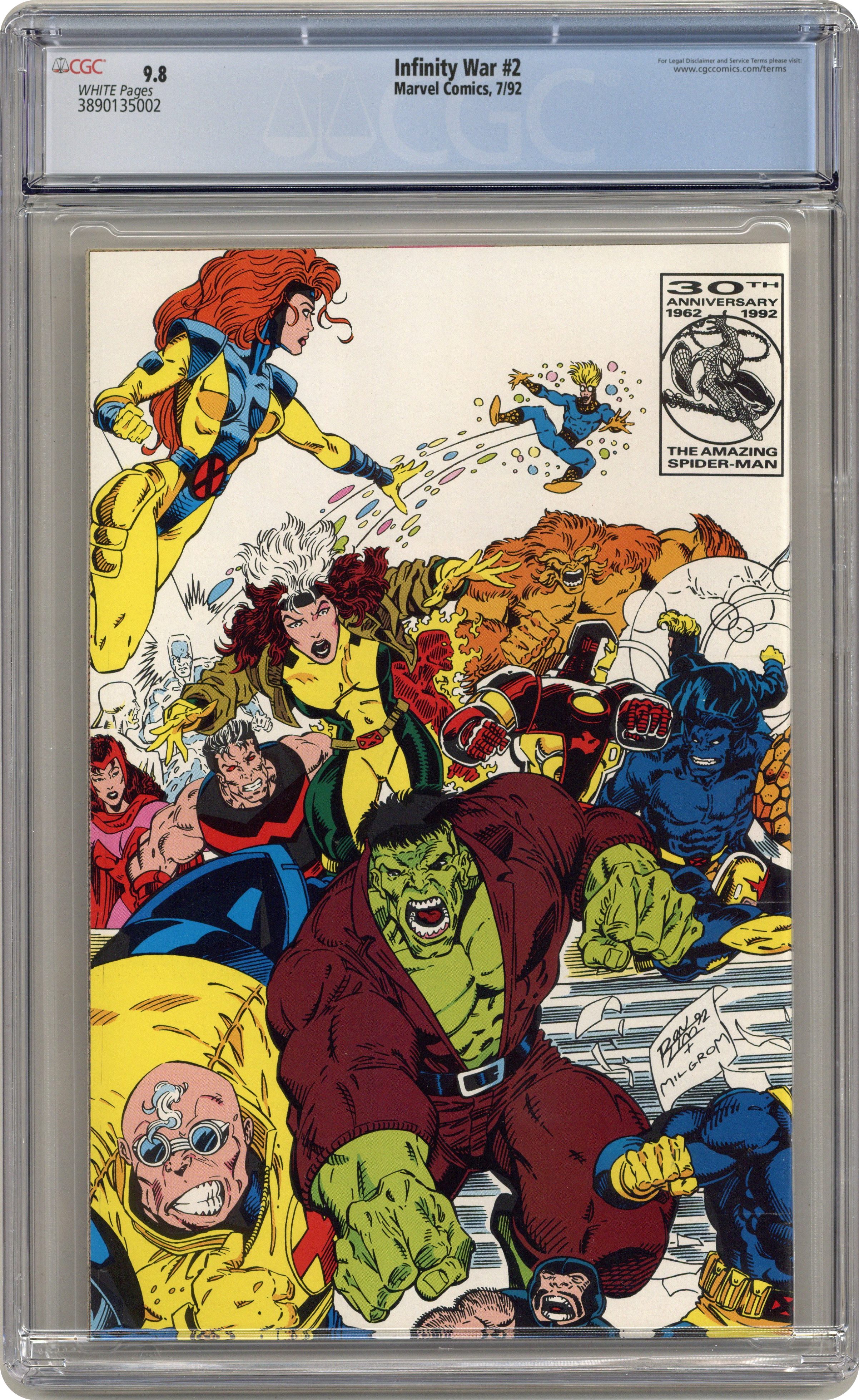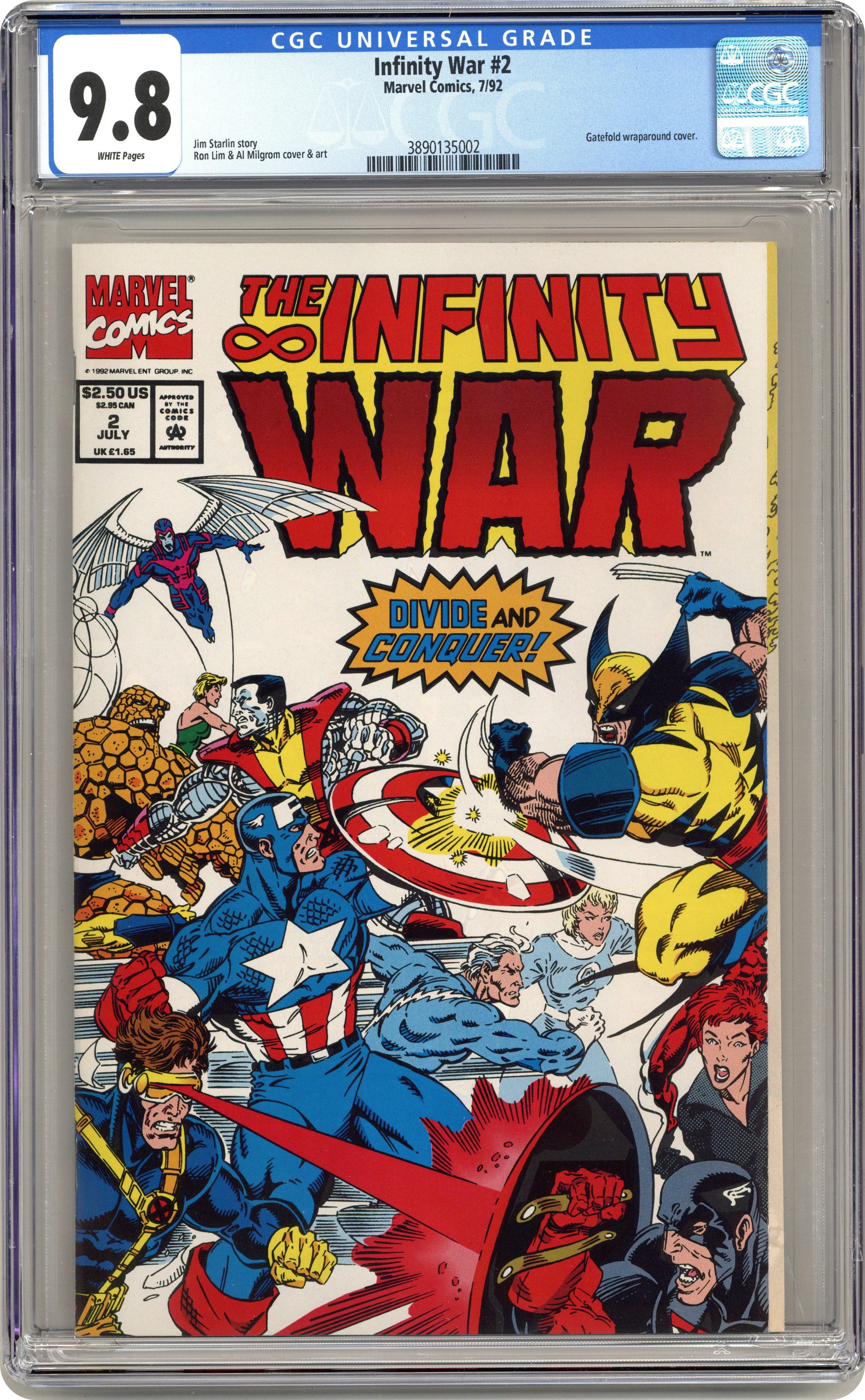 Story by Jim Starlin. Art by Ron Lim and Al Milgrom. The Avengers, Fantastic Four, X-Men, X-Factor, Alpha Flight, Daredevil, Hulk, Moon Knight, and the New Warriors have all gathered at the behest of Reed Richards. Meanwhile, Galactus, Silver Surfer, Nova, and Dr. Strange investigate a mystical disturbance, followed in the shadows by the nefarious duo Dr. Doom and Kang. Thanos, Adam Warlock and the Infinity Watch pay a visit to Mistress Death to discover a startling revelation. Plus, when the volatile mutant Wolverine accuses Reed Richards of being an imposter the tensions between the mutant heroes and the others escalates into a battle royal. Then, the evil-Reed doppleganger springs his trap as a gamma bomb explodes. Story by Jim Starlin. Art by Ron Lim and Al Milgrom. 48 pages. Cover price $2.50. Grade: CGC 9.8 explanation of grade Condition: Used (collectible)