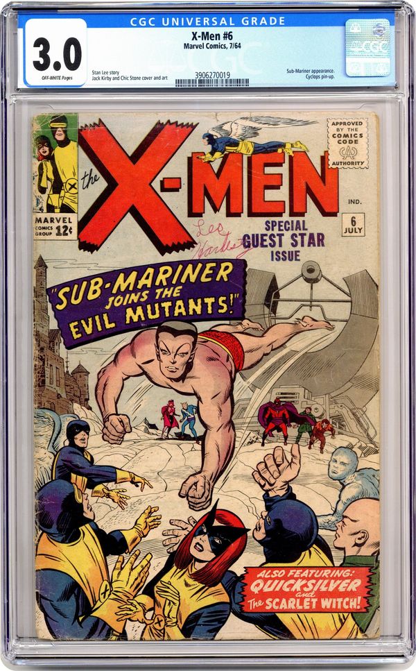 Ended Oct 16 2023 Winning Bid $151 Cover pencils by Jack Kirby, inks by Chic Stone. Sub-Mariner! Joins the Evil Mutants, script by Stan Lee, pencils by Jack Kirby, inks by Chic Stone; Xavier reads a news story about Namor and wonders if he is a possible mutant; Magneto comes to the same conclusion and invades the Sub-Mariner's realm with an invitation to join his Brotherhood; Enchanted by the Scarlet Witch, Namor agrees; The X-Men attack and, during the ensuing battle, Namor decides not to join either team, mutant or no. Cyclops Special Pin-Up Page, pencils by Jack Kirby, inks by Chic Stone. 36 pgs. $0.12. Cover price $0.12. Grade: CGC 3.0 explanation of grade Condition: Used (collectible)