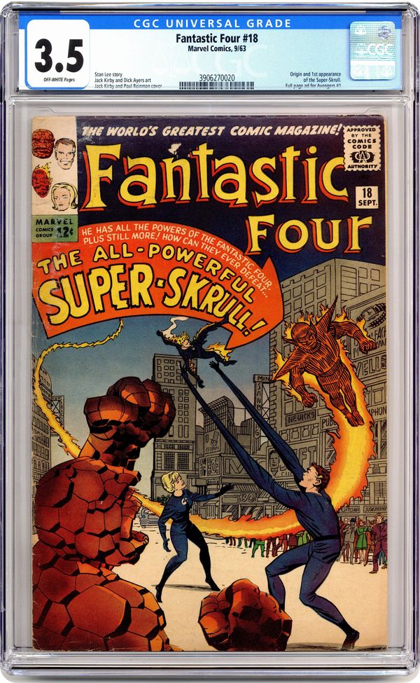 Ended Nov 5 2023 Winning Bid $210 Cover pencils by Jack Kirby, inks by Paul Reinman. Origin and first appearance of the Super Skrull in "A Skrull Walks Among Us!", script by Stan Lee, pencils by Jack Kirby, inks by Dick Ayers; The Skrull Emperor sends the Super-Skrull, a Skrull possessing all the powers of the Fantastic Four, to conquer Earth. In answer to a question from Paul B. Weinstein about who originated the corner cover symbol box, Stan Lee replied: "Steve Ditko dreamed up the idea, and we're sure glad he did!" 36 pgs. $0.12. Cover price $0.12. Grade: CGC 3.5 explanation of grade Condition: Used (collectible)