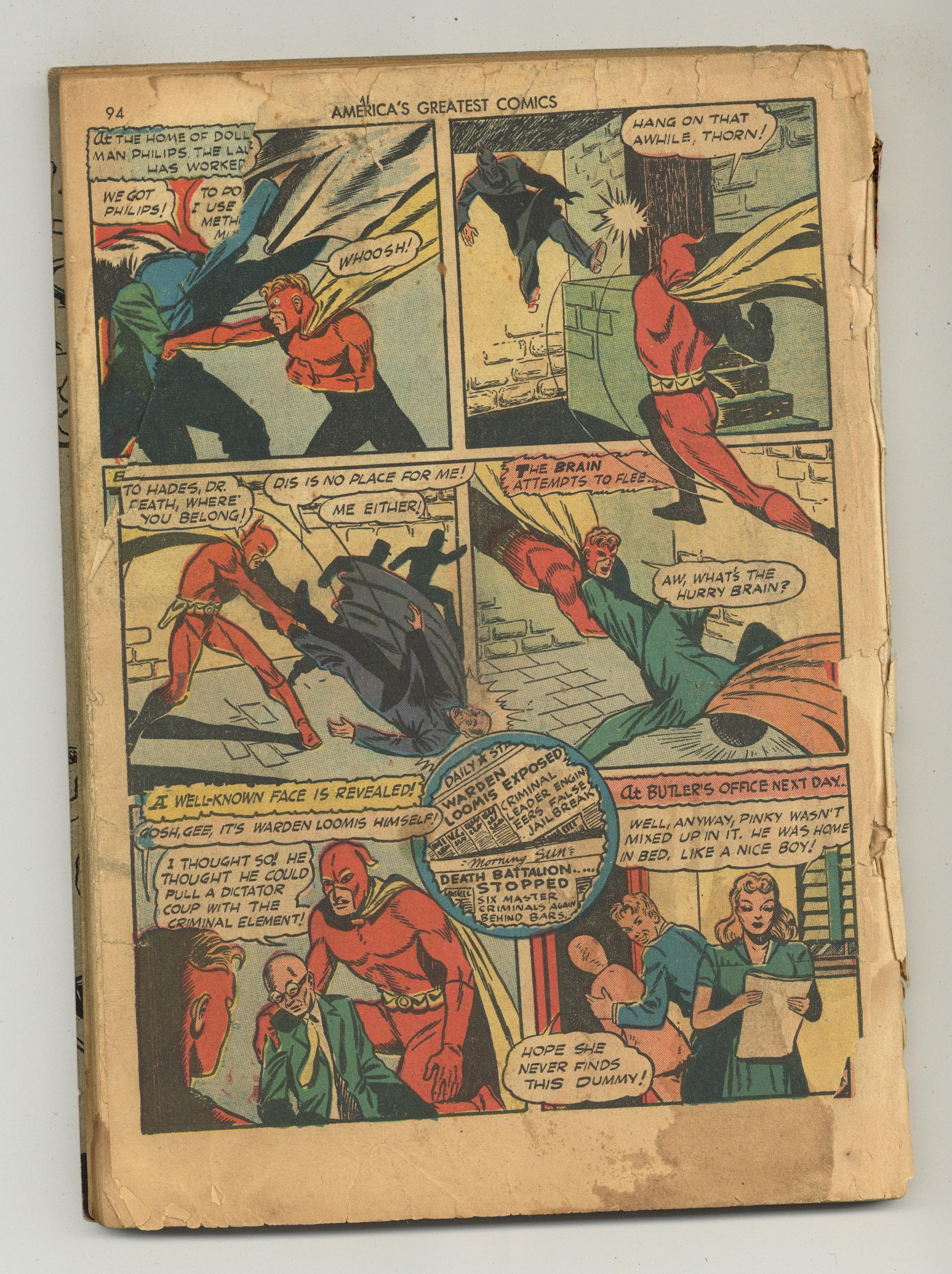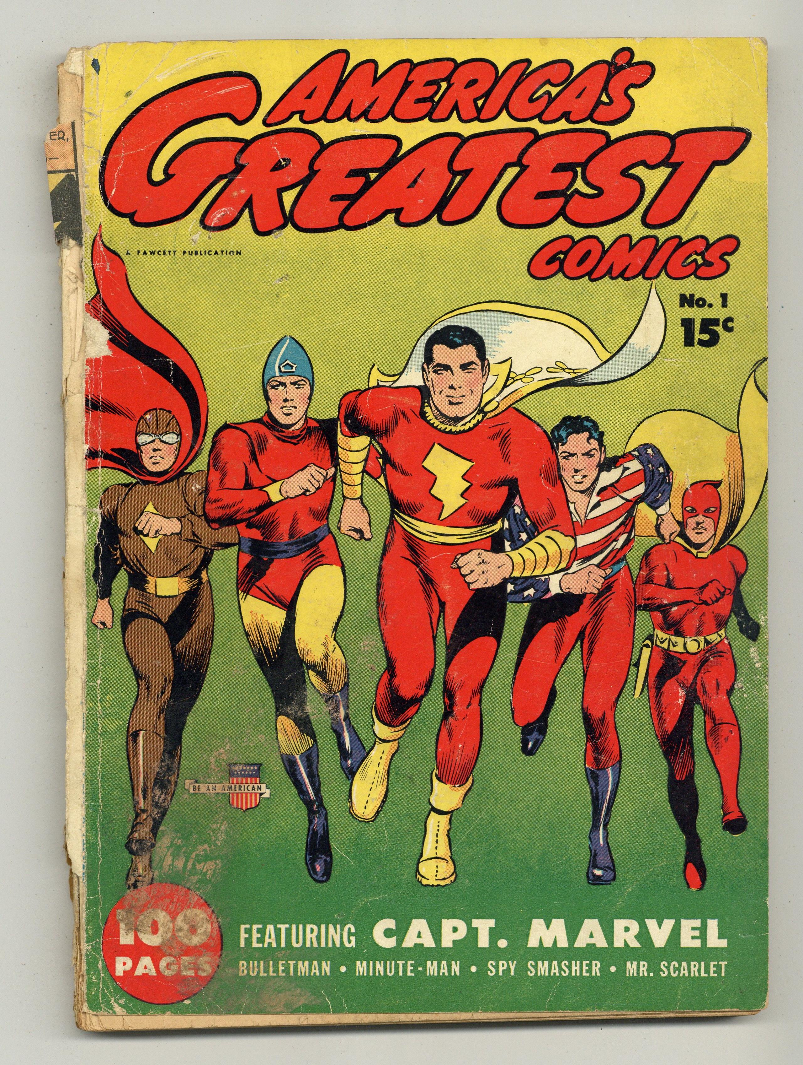 Cover by Mac Raboy. Stories and art by C.C. Beck, Mac Raboy, Phil Bard, Tom McNamara, Charles Sultan and Joseph J. Millard. Fawcett's first squarebound comic is an anthology of its greatest superheroes, including Bulletman, Spy Smasher, and of course the original Captain Marvel (Shazam). Captain Marvel travels to the West Coast to find the mysterious Ghost of the Deep, who is sinking Allied ships with a strange power. Bulletman and Bulletgirl track a mysterious, invisible killer whose victims vanish without a trace. Minute Man faces the horrifying Mr. Skeleton, who is trying to coerce US military leaders to turn against America. Plus a vintage ad for a contest for Marvel Comics - the OTHER Marvel Comics, the ones featuring Human Torch and Sub-Mariner - that would later co-opt the name "Marvel." This issue's cover is the first time that Fawcett's super-heroes appeared together on a cover. Captain Marvel: Ghost of the Deep; Bulletman: The Riddle of the Ages; Death Doesnt Whisper; Minute Man Meets Mr. Skeleton; Chubby; Spy Smasher; Strange But True; Mr. Scarlet and Pinky: The Death Battalion. 96 pages, Full Color. Cover price $0.15. Grade: PR 0.5 explanation of grade Condition: Used (collectible)