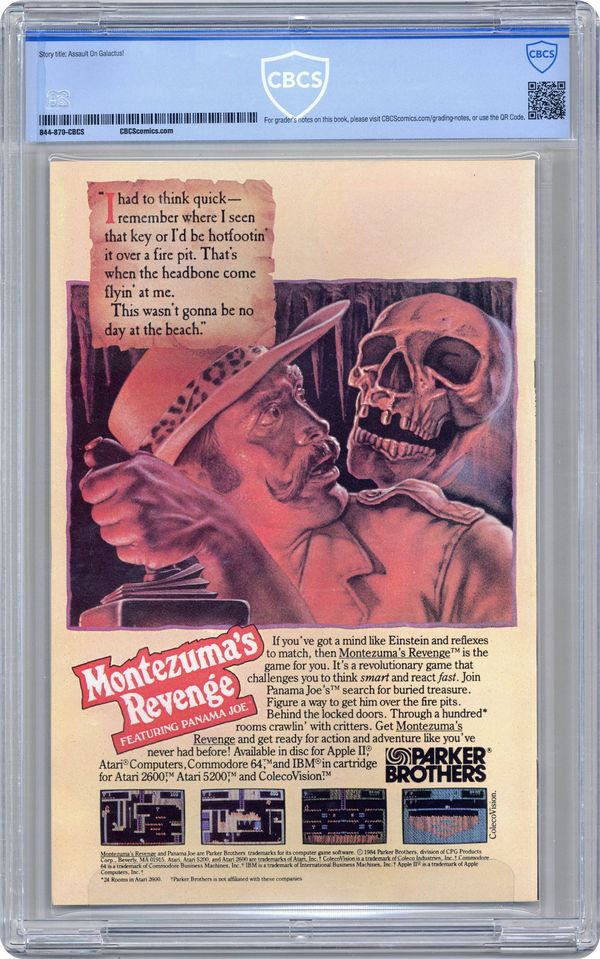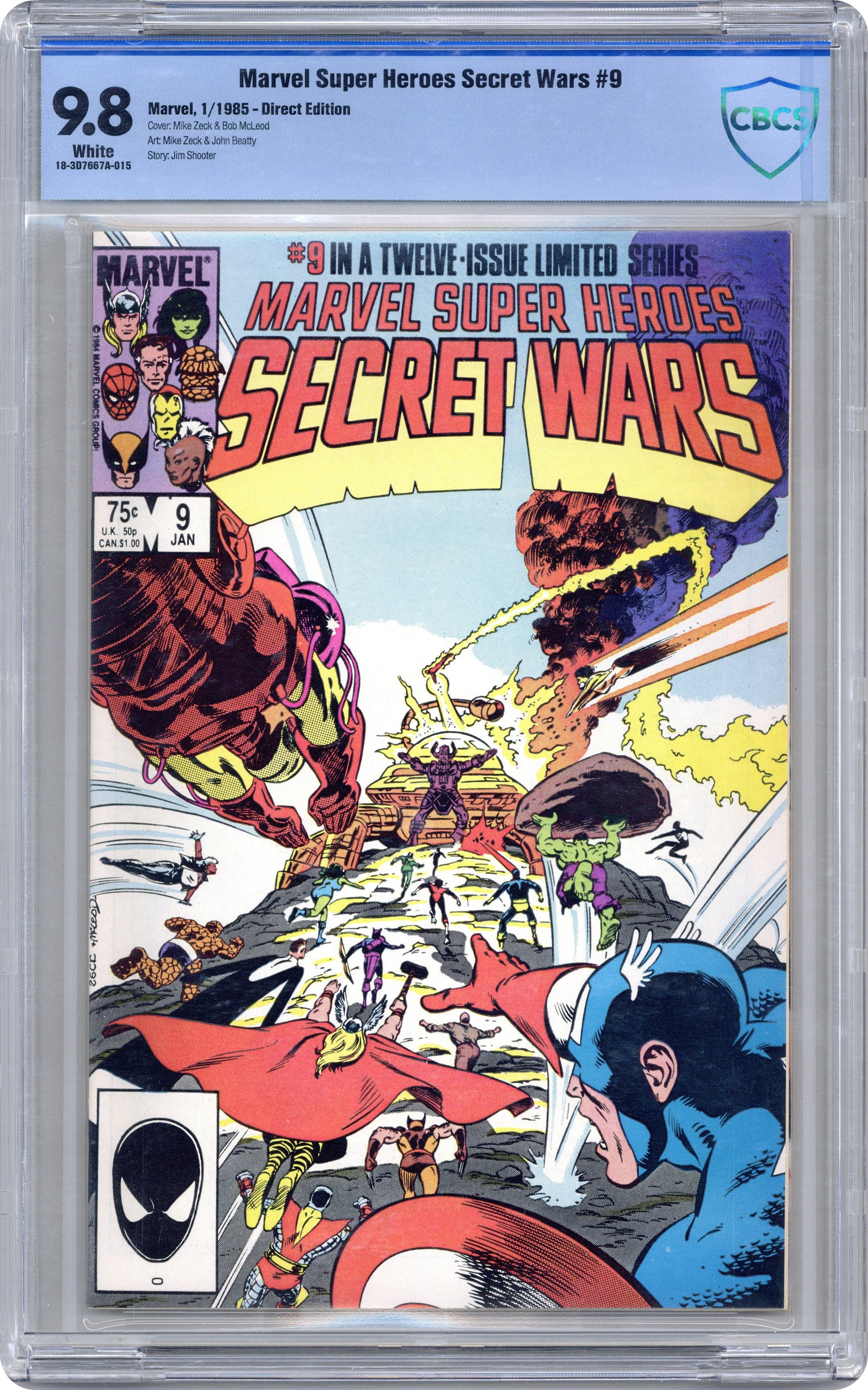 Direct Edition. "Assault on Galactus!" Part 9 of 12. Story by Jim Shooter. Art by Mike Zeck and John Beatty. The World Devourer makes his ultimate move. Can even the combined powers of the Avengers, Fantastic Four, X-Men, Magneto, Spider-Man, and Incredible Hulk prevent mighty Galactus from consuming Battleworld, thus destroying everyone and everything on it? Plus, watch as Doctor Doom's diabolical scheme comes to fruition. 36 pages, full color. Cover price $0.75. Grade: CBCS 9.8 explanation of grade Condition: Used (collectible)