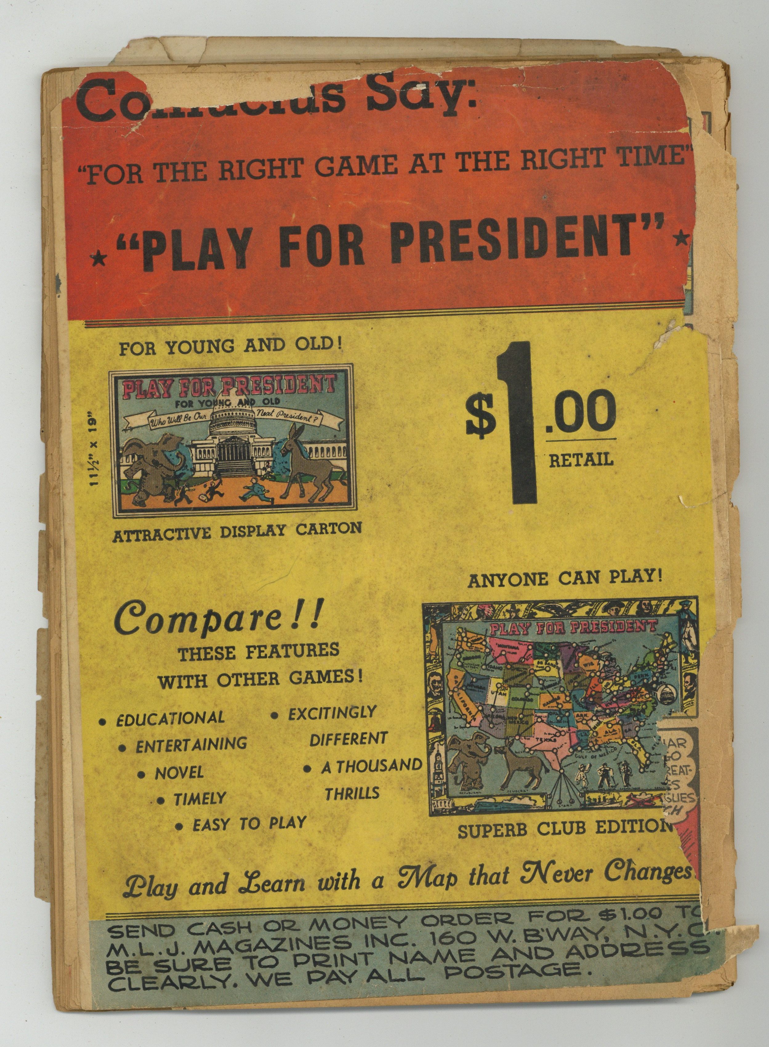 SOLD$249.95- Interior is complete, but brittle and damaged along spine and edges. Cover and first wrap detached and fully split at spine, centerfold detached with edge pieces missing.