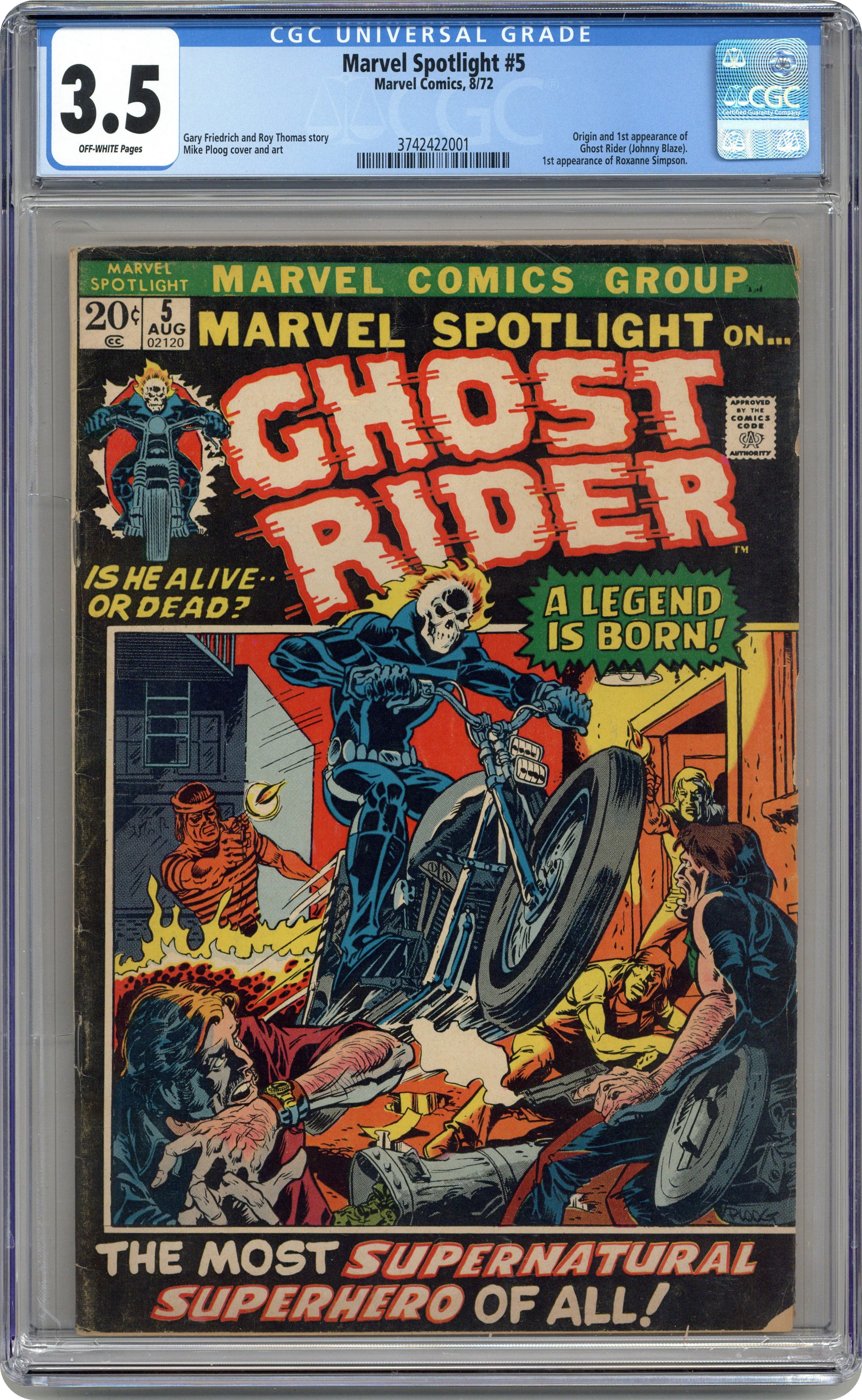Origin and first appearance of the Ghost Rider. First appearance of Roxanne Simpson. Cover art by Mike Ploog. Origin of the Ghost Rider, script by Roy Thomas and Gary Friedrich, art by Mike Ploog; To save the life of his mentor and the man who has become like a father to him, Johnny Blaze makes a deal with the devil and is transformed into the spirit of vengeance, Ghost Rider. 36 pages, full color. Cover price $0.20. Grade: CGC 3.5 explanation of grade Condition: Used (collectible)