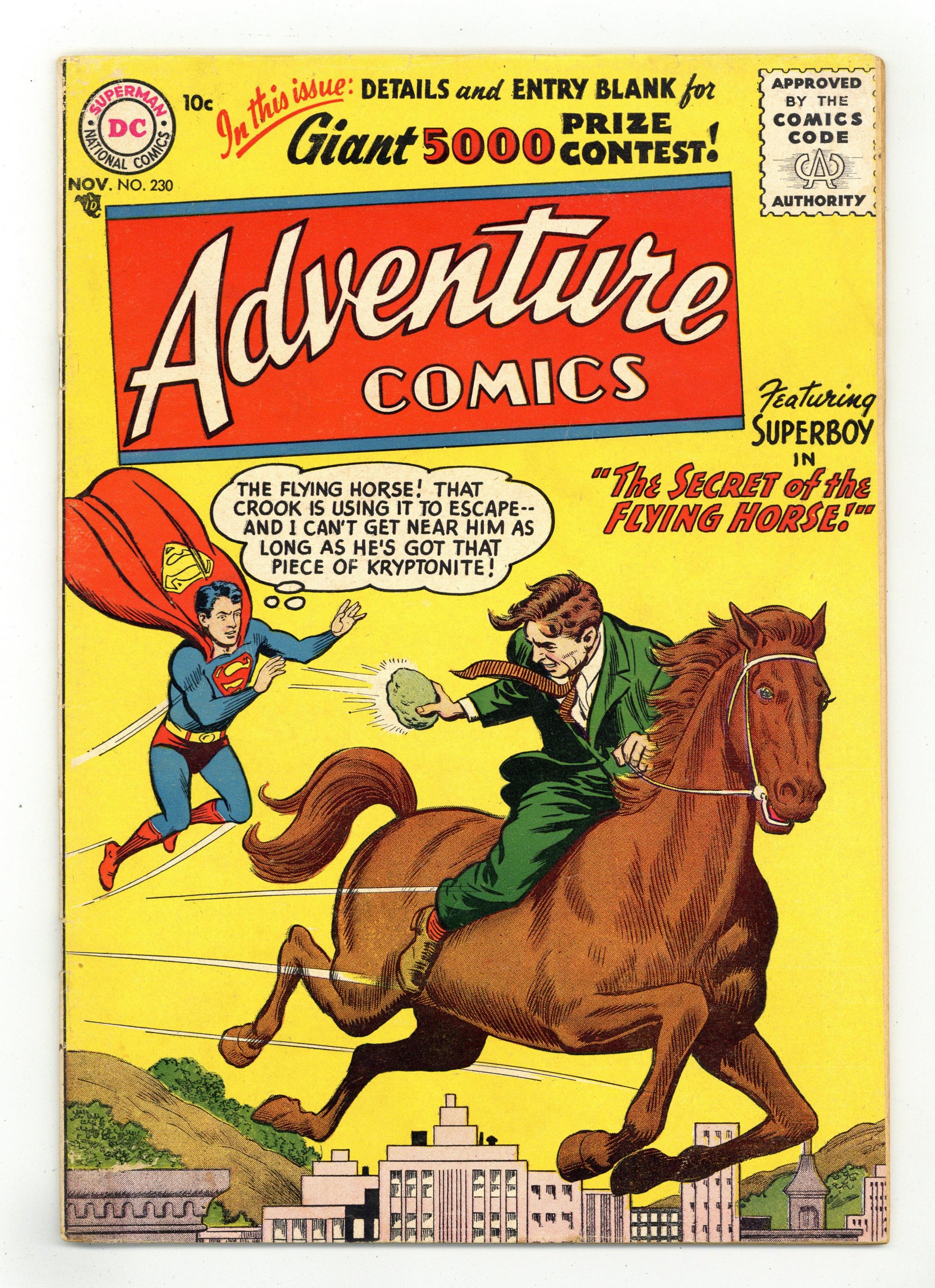 Cover pencils by Curt Swan, inks by Ray Burnley. The Secret of the Flying Horse, script by Otto Binder, pencils by Curt Swan, inks by George Klein; Superboy meets a super-horse from another planet. The Tom Thumb Aquaman, art by Ramona Fradon. The Outlaw Archers starring Green Arrow, art by George Papp. 36 pages, Full Color. Cover price $0.10. Grade: GD 2.0 explanation of grade Condition: Used (collectible)