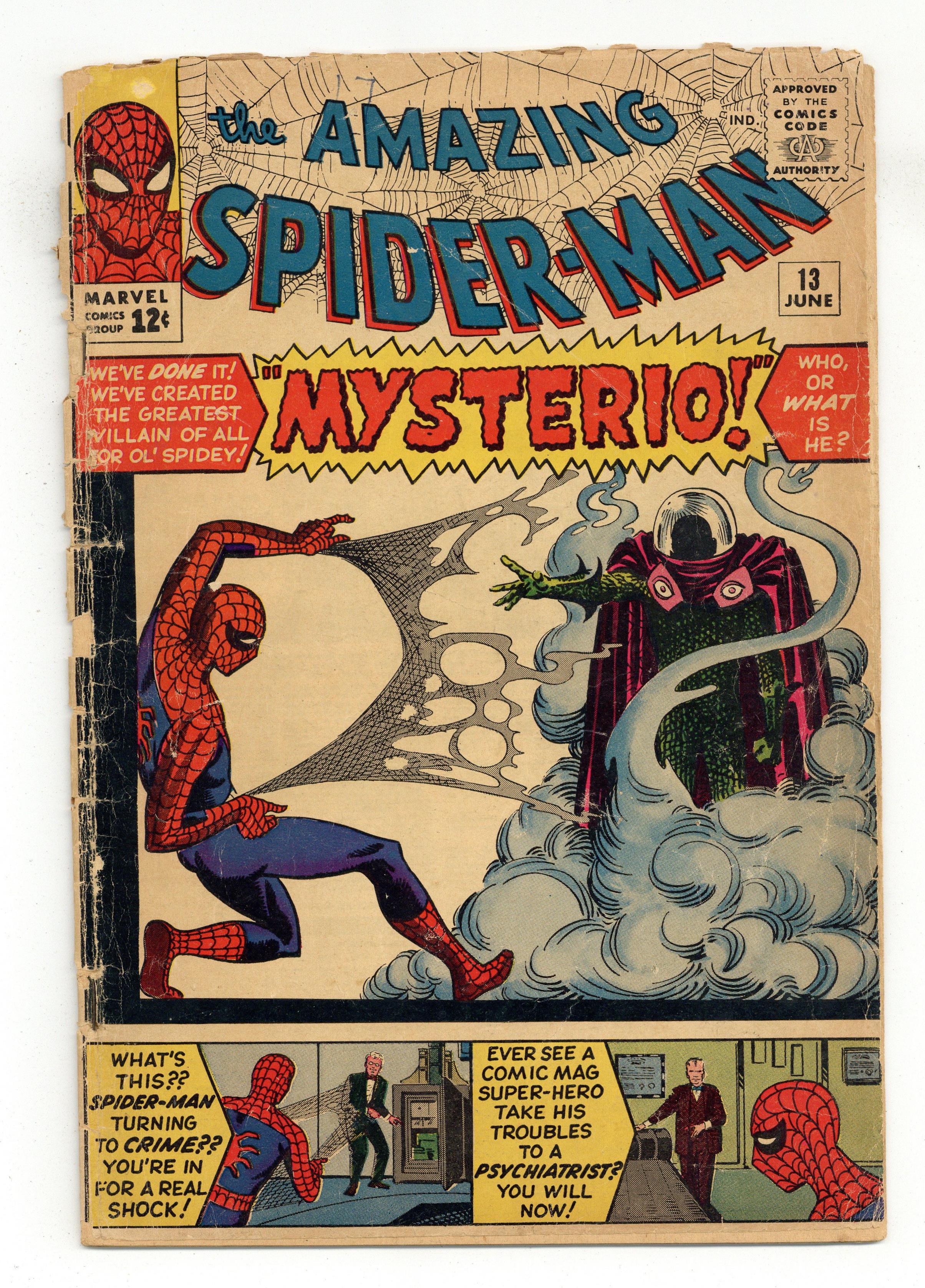 Cover art by Steve Ditko. First appearance of Mysterio in The Menace of... Mysterio!, script by Stan Lee, art by Steve Ditko; Mysterio first frames Spider-Man for a crime wave, then challenges him to a battle on top of the Brooklyn Bridge. Reprinted in Marvel Tales # 8 and 151. 36 pages, full color. Cover price $0.12. Grade: FR 1.0 explanation of grade Condition: Used (collectible)