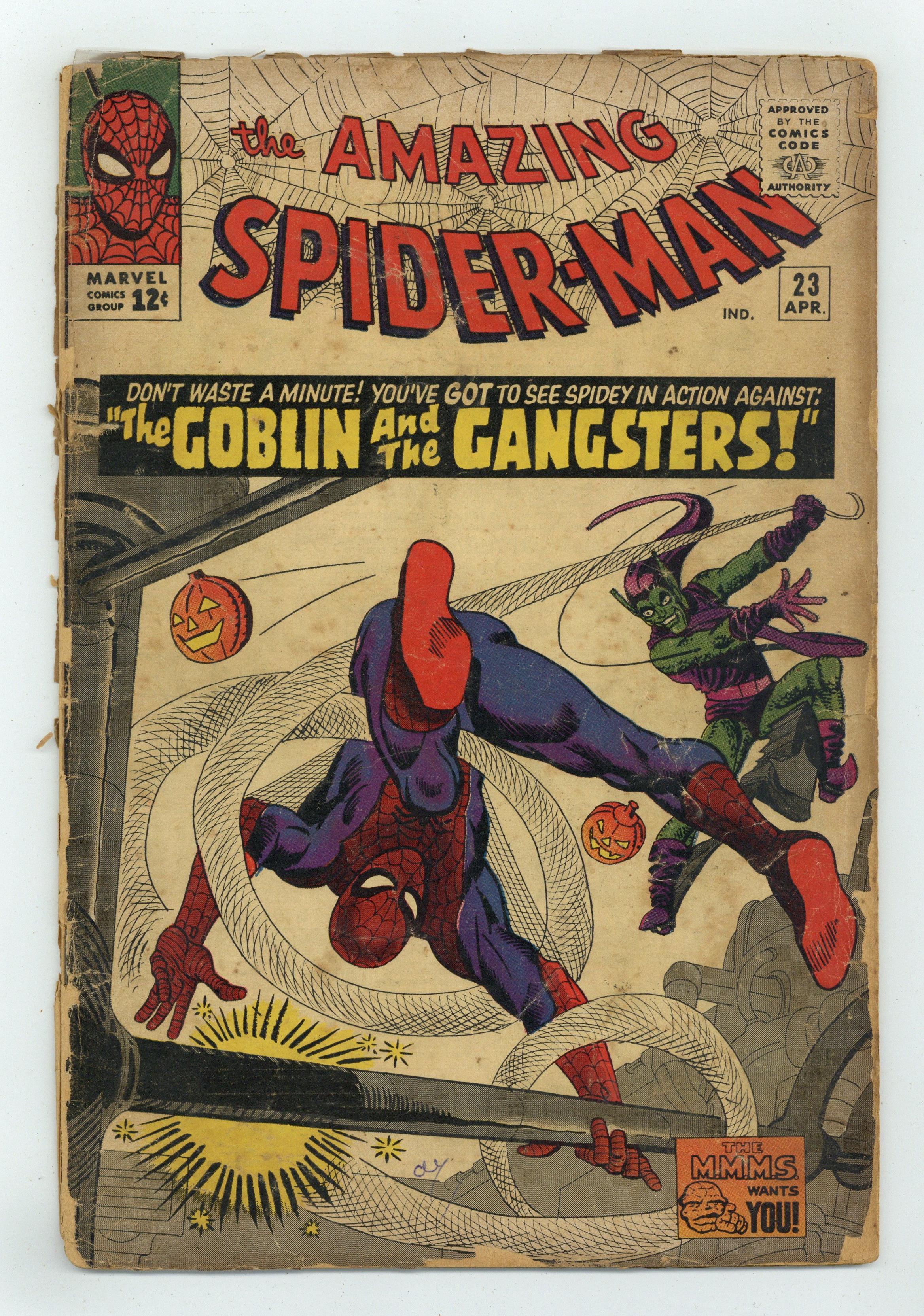 Cover art by Steve Ditko. The Goblin and the Gangsters, script by Stan Lee, art by Steve Ditko; the Green Goblin returns and wants to take over Lucky Lobos mob; Spidey battles Lucky Lobo and his gang; Spidey fights the Green Goblin in a factory. Reprinted in Marvel Tales # 18 and 161. Letter from Jim Shooter, former editor-in-chief at Marvel, critiquing Marvel's handling of Spider-Man. 36 pgs. $0.12. Cover price $0.12. Grade: PR 0.5 explanation of grade Condition: Used (collectible)