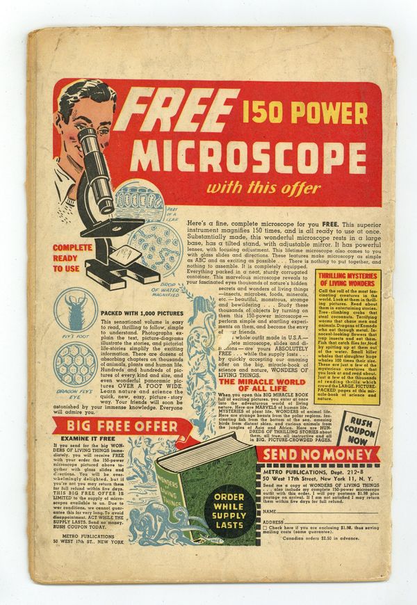 Cover art by Alex Schomburg. Masters of Evil starring Captain America, pencils by Vince Alascia, inks by Al Bellman; As Cap and Bucky bust up Terrible Tom Garrett's gang, the boss steals a car and drives out to the woods where he runs out of gas; On foot he comes upon the dwelling of Terdu the sorcerer who claims to have observed his battle with Cap and Bucky in his cauldron and offers the gangster his help in evil doings. The Swanky Swindlers starring the Human Torch, art by Al Bellman. The Discs of Death starring Whizzer. 36 pgs. $0.10. Cover price $0.10. Grade: FR/GD 1.5 explanation of grade Condition: Used (collectible)