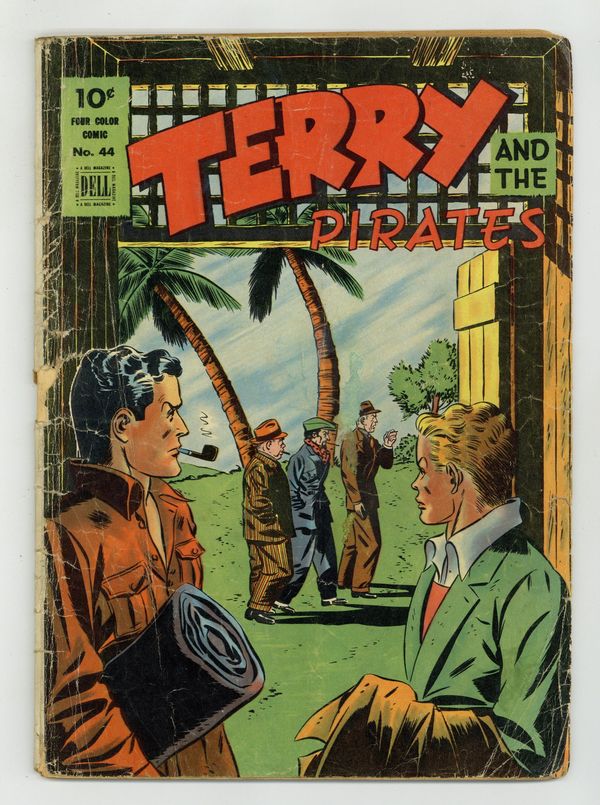 Indicia title is "TERRY AND THE PIRATES, No. 44." Untitled Terry and the Pirates strips, scripts and art by Milton Caniff. Connie and Big Stoop get a $5,000 reward from Mr. Smythe-Heatherstone and hire servants to do their work for Pat and Terry. After a confrontation with Baron De Plexus and his bodyguard, Pat decides to leave Hong Kong and take Terry, Connie, and Big Stoop to see Smythe-Heatherstone. At the plantation, Pat and Terry meet April Kane, the young sister of Dillon Kane, who has disappeared. Pat and Connie find Dillon Kane being held captive in the cave. Sanjak shows up at De Plexus' airstrip with a hypnotized April. De Plexus and his thugs try to get information on Sanjak in Yankuk, but the populace, even the underworld, refuses to give them any information. Reprints Terry and The Pirates (Chicago Tribune-N.Y. News Syndicate) newspaper strips from 1938 and 1939. 52 pages, full color. Cover price $0.10. Grade: FR/GD 1.5 explanation of grade Condition: Used (collectible)