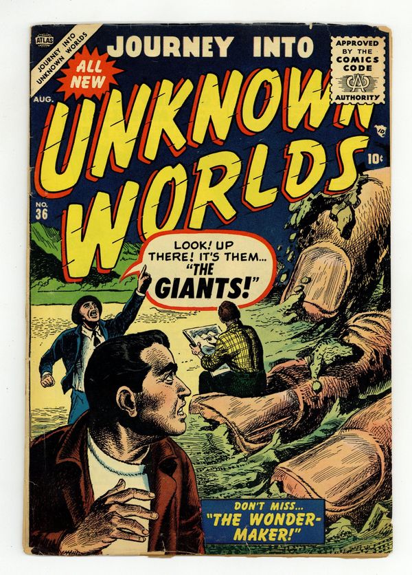 Cover art by Carl Burgos. The Giants, art by Paul Reinman; An archeologist wills himself back into the past, discovers that a race of intelligent good-humored "mutant giants" coexisted with Pithecanthropus erectus, and sets in motion a chain of events which wipes out the race of giants. The Appointment text story. Calculated Risk, art by Mac L. Pakula; A story told from the point of view of a robot who is kept under guard while scientists use him to answer calculations bearing on questions of national security. Down to the Sea!, art by Jack Katz; A sea captain in love with the sea is saved by the sea after it wrecks his vessel. Flying Saucer!, art by Manny Stallman; An alien gets the idea of installing flying saucer rides in amusement parks as a way of calming fears about flying saucers. The Wonder Maker!, art by Sid Greene. 36 pgs. $0.10. Cover price $0.10. Grade: GD+ 2.5 explanation of grade Condition: Used (collectible)