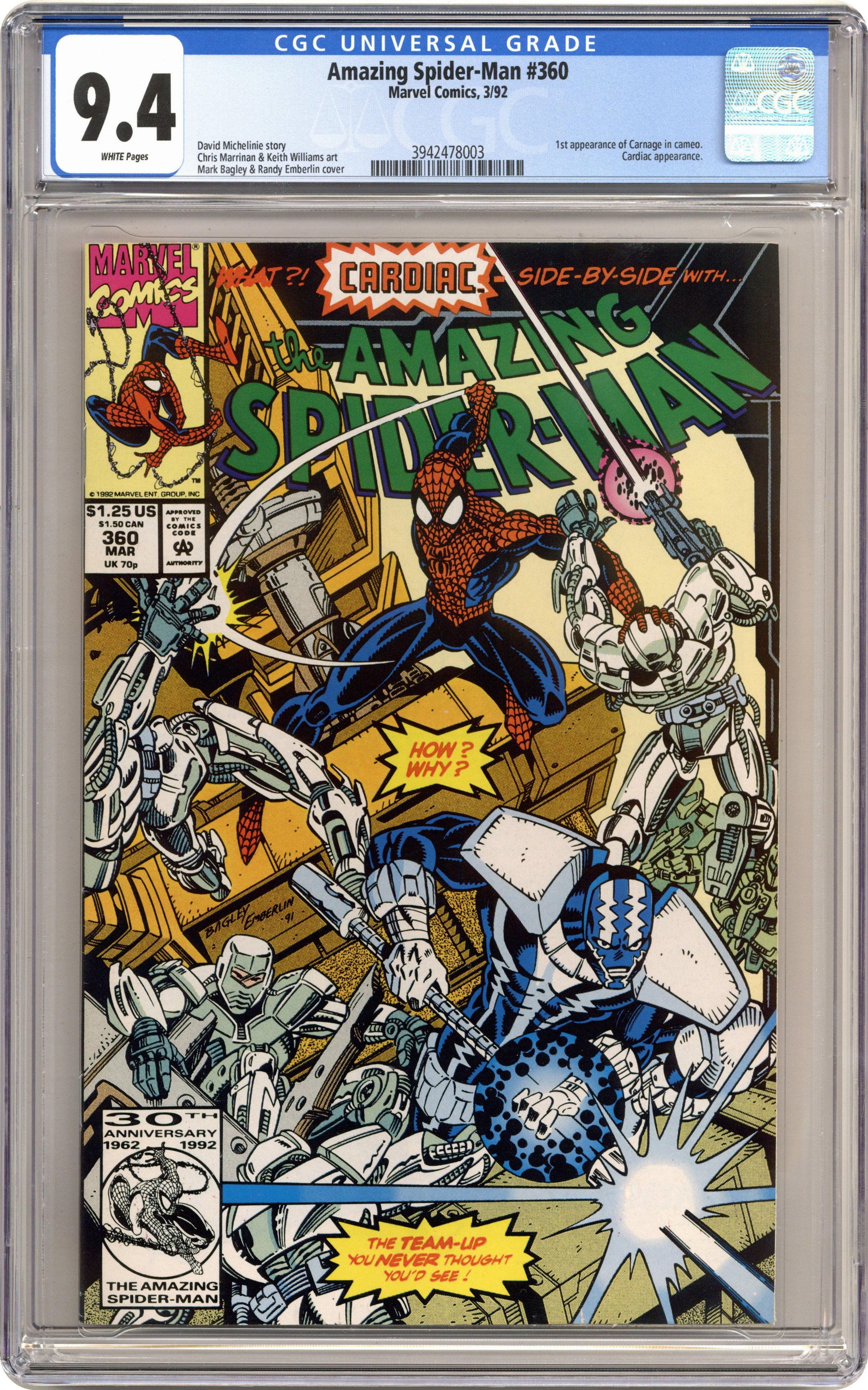 Direct Edition. "Death Toy!" Part 2 of 2. Script by David Michelinie. Pencils by Chris Marrinan. Mark Bagley. Inks by Keith Williams. Cover by Mark Bagley and Randy Emberlin. At the Tech-Toy warehouse, Cardiac and the wall-crawler come to a meeting of the minds about their pursuits of justice! Perhaps it's possible for them to work together after all! The next evening at Stane International, Spider-Man and Cardiac team up to stop the illegal manufacturing of military weapons! Could this be the beginning of a beautiful friendship? Not quite! Meanwhile, a new blood-hued super-villain makes his first savage kill...the first of many! Cameo appearances by Carnage, Mary Jane Watson, Ben Urich, Joy Mercado, and J. Jonah Jameson. Origin of Cardiac. (Notes: Cardiac returns in Amazing Spider-Man 376. The letters page contains a statement of ownership: average print run 470,075; average paid circulation 340,977.) 36 pages. $1.25 cover price. Cover price $1.25. Grade: CGC 9.4 explanation of grade Condition: Used (collectible)